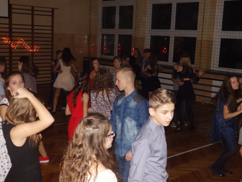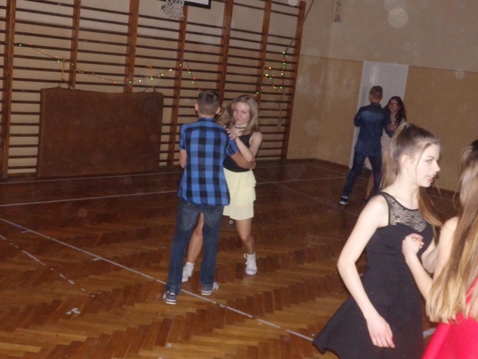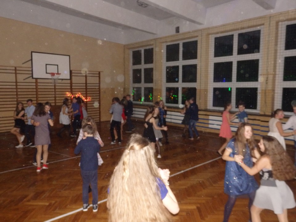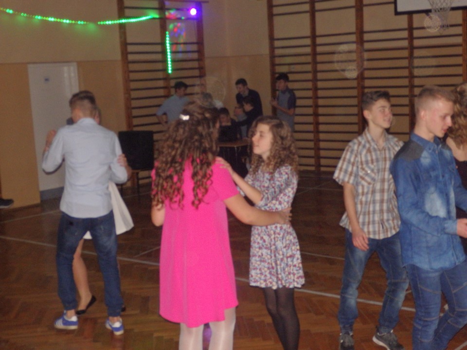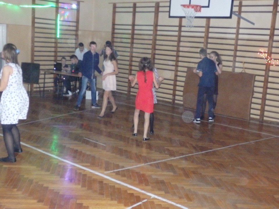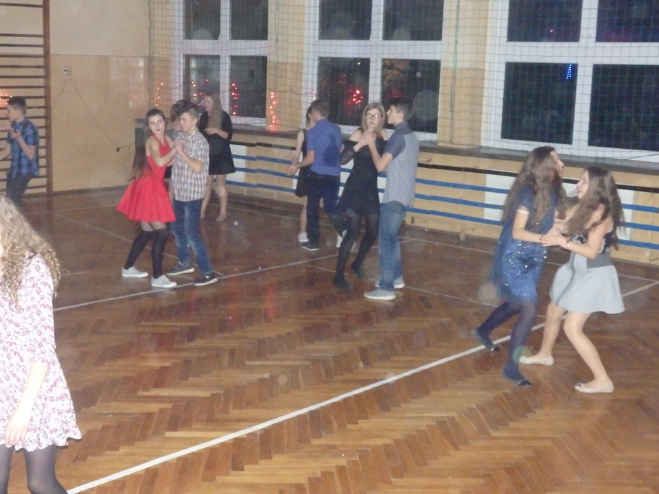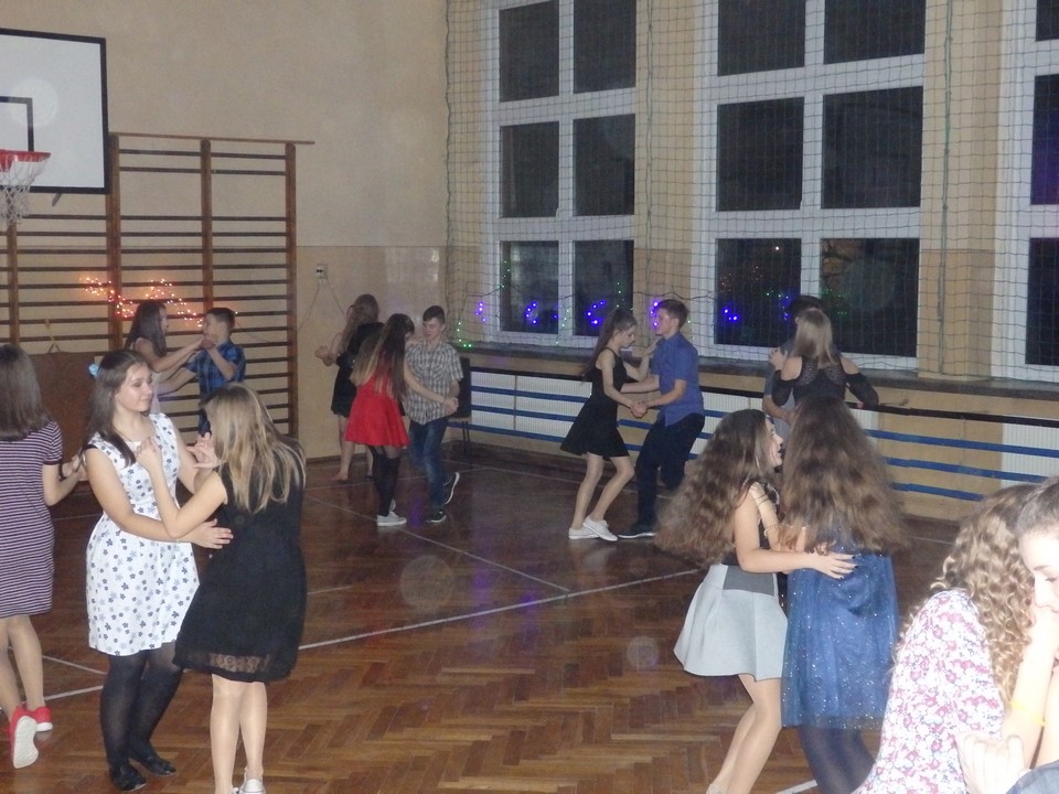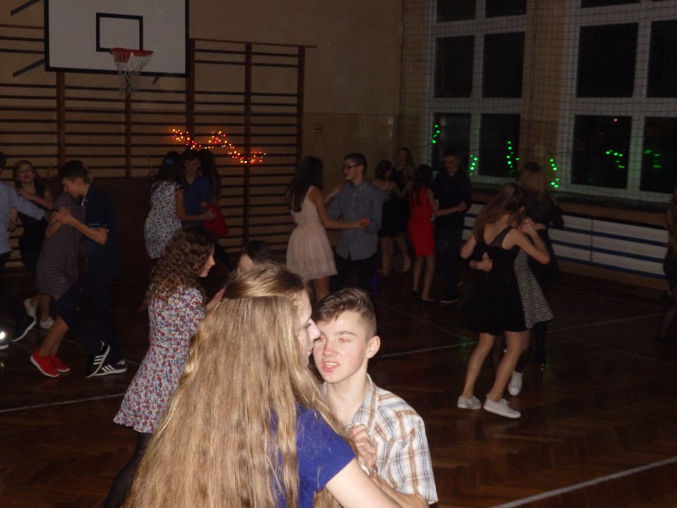 Sobotni wieczór gimnazjaliści spędzili w szkole. Było wesoło, radośnie. Młodzież świetnie bawiła się na parkiecie sali gimnastycznej. Rodzice przygotowali dla nich słodki poczęstunek.
