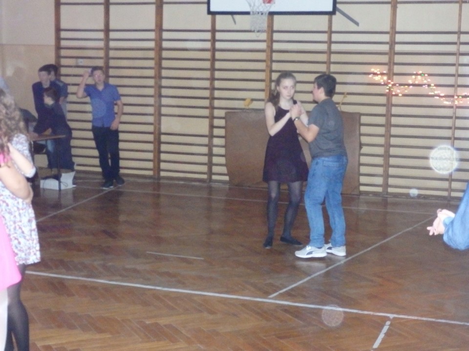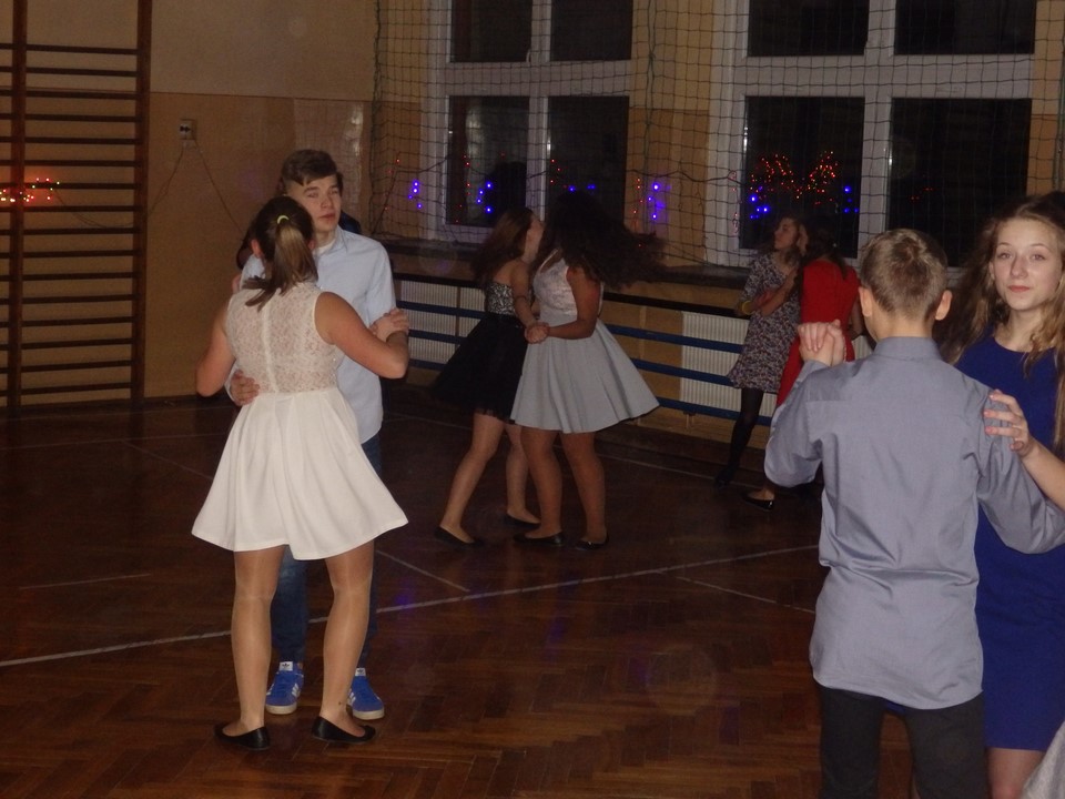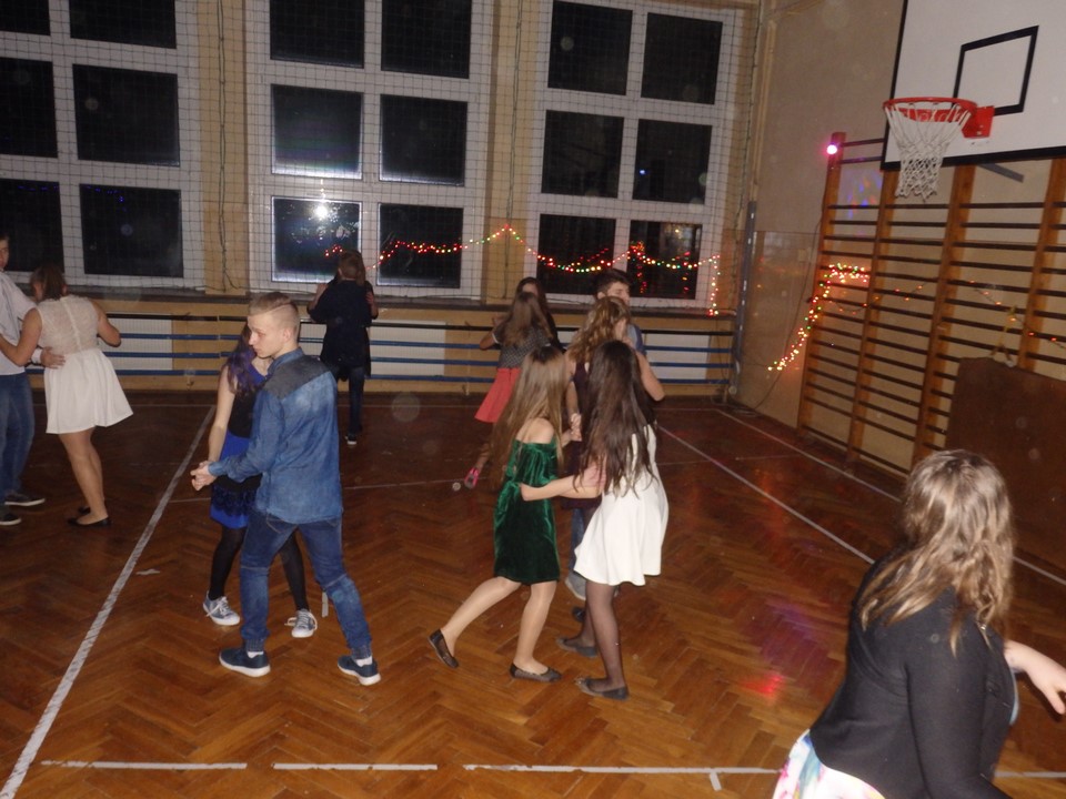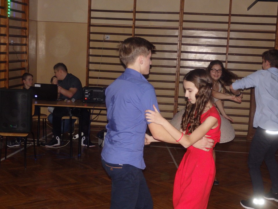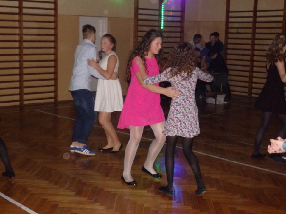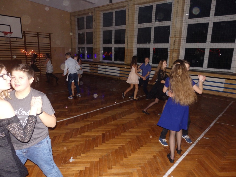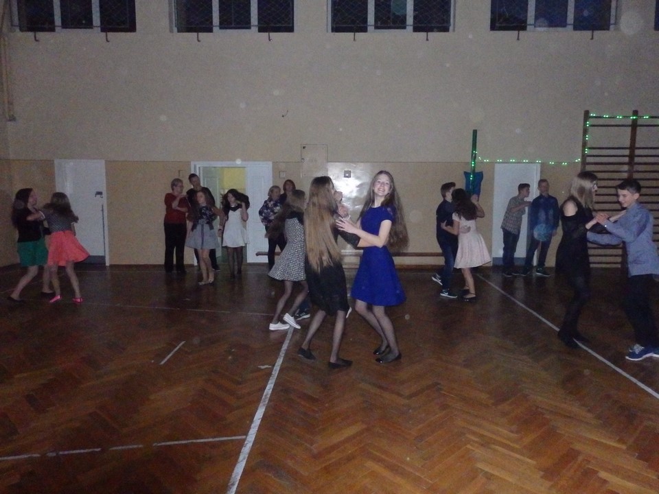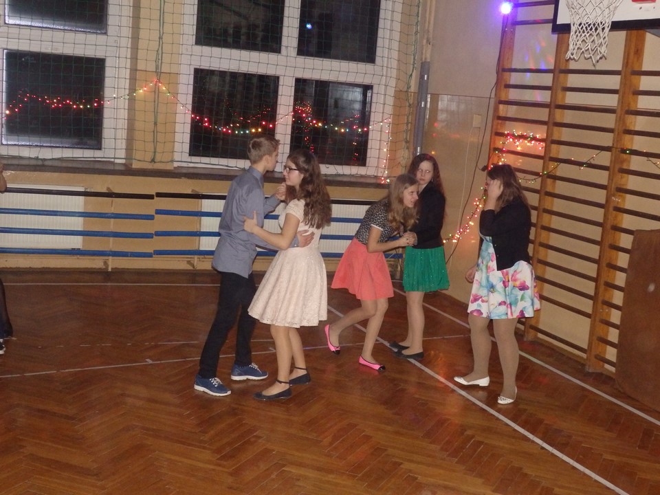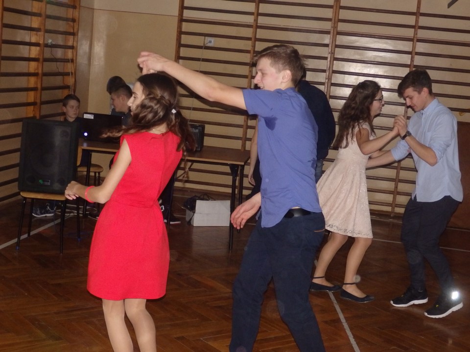 Sobotni wieczór gimnazjaliści spędzili w szkole. Było wesoło, radośnie. Młodzież świetnie bawiła się na parkiecie sali gimnastycznej. Rodzice przygotowali dla nich słodki poczęstunek.