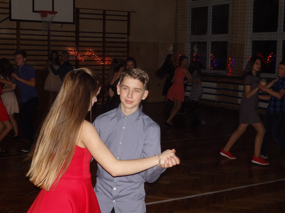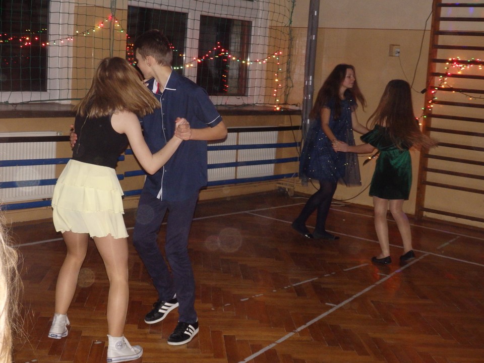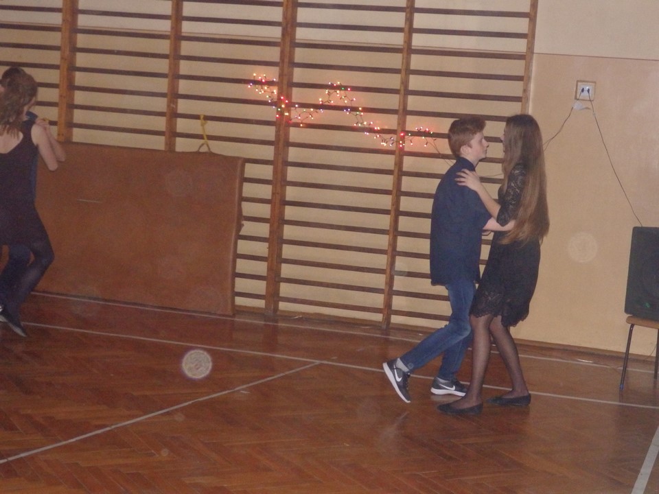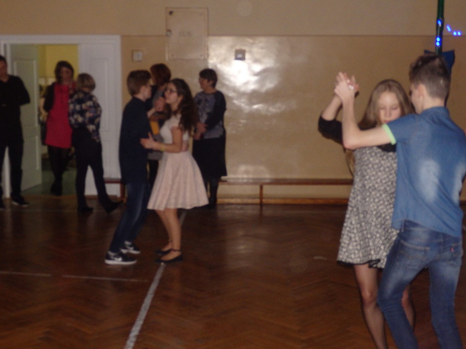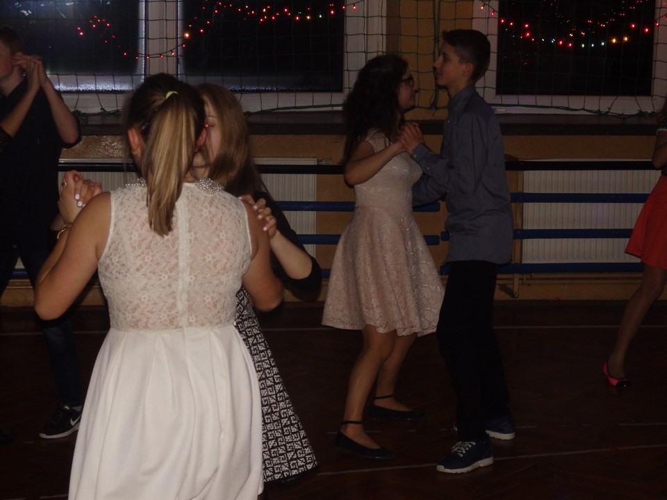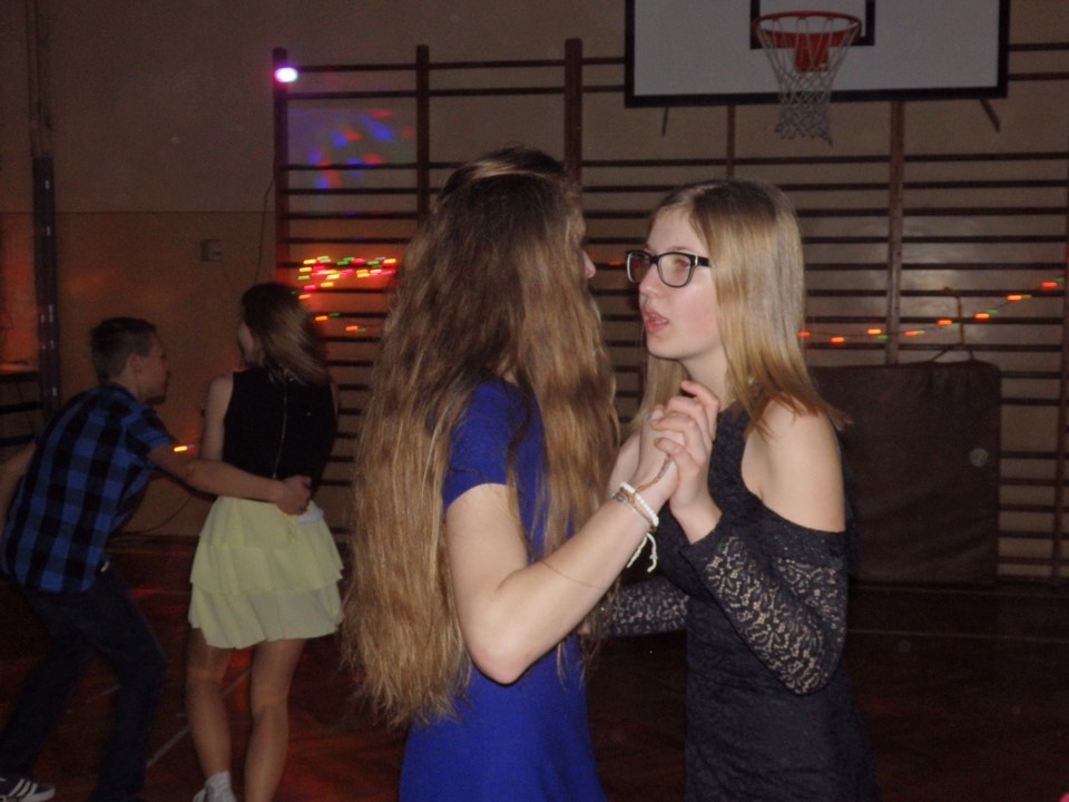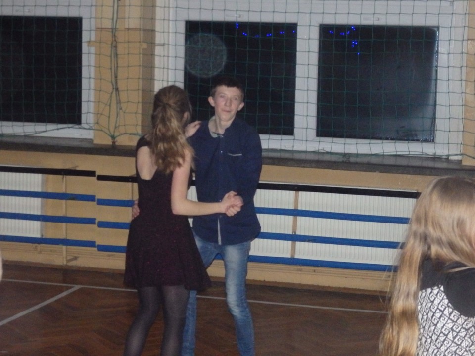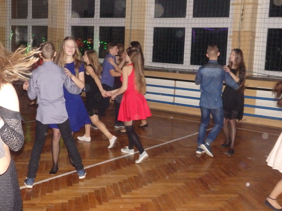 Sobotni wieczór gimnazjaliści spędzili w szkole. Było wesoło, radośnie. Młodzież świetnie bawiła się na parkiecie sali gimnastycznej. Rodzice przygotowali dla nich słodki poczęstunek.