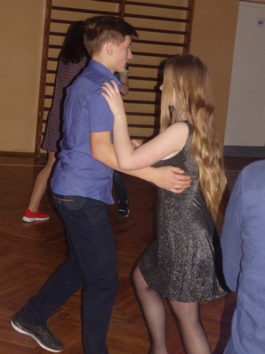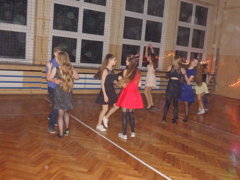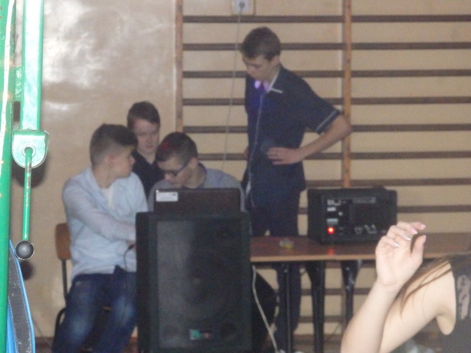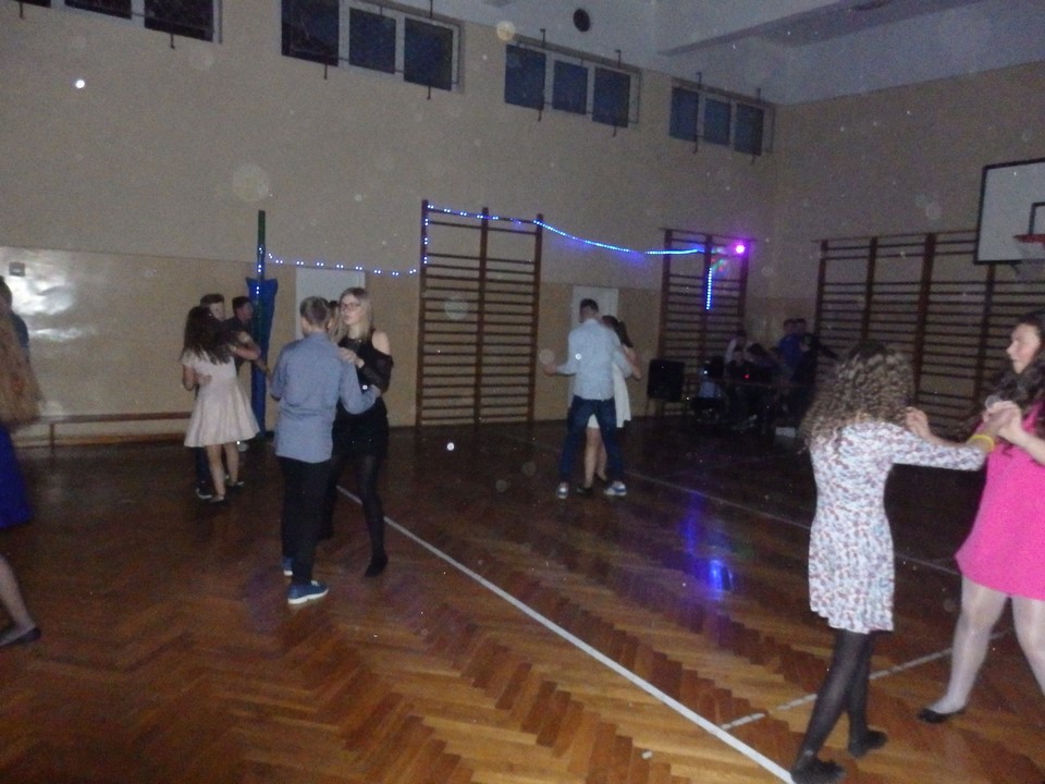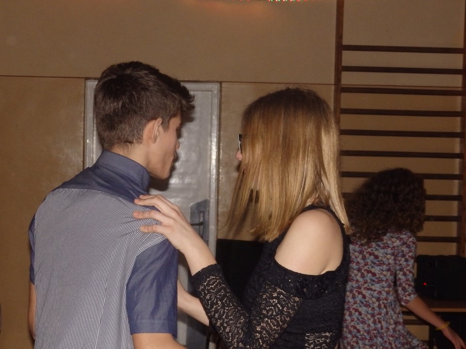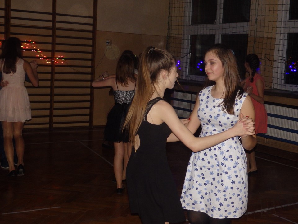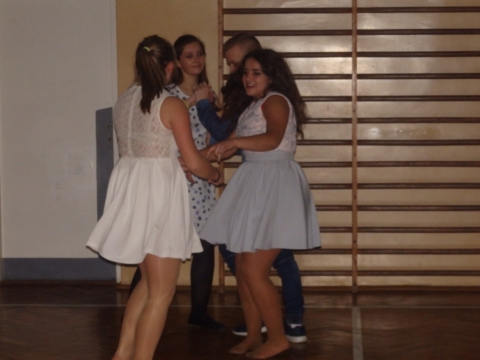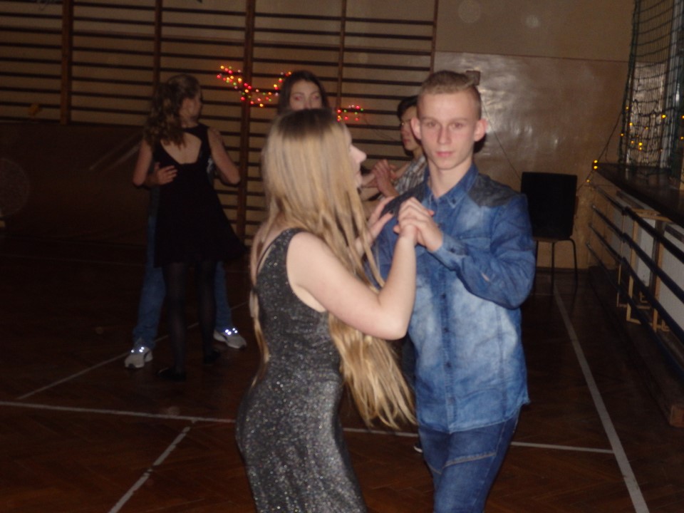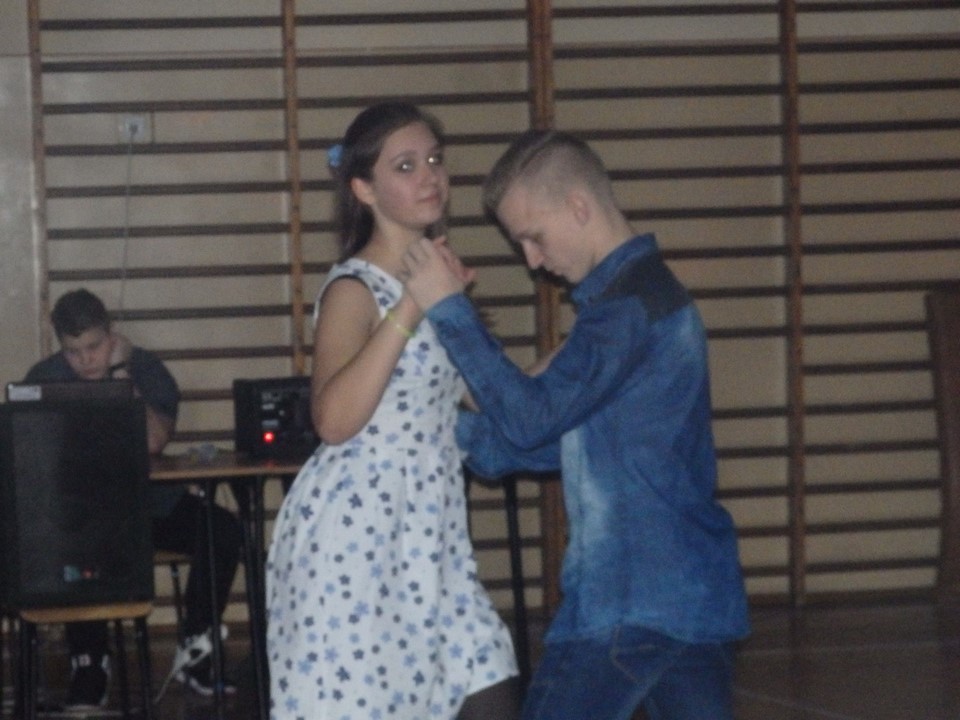 Sobotni wieczór gimnazjaliści spędzili w szkole. Było wesoło, radośnie. Młodzież świetnie bawiła się na parkiecie sali gimnastycznej. Rodzice przygotowali dla nich słodki poczęstunek.