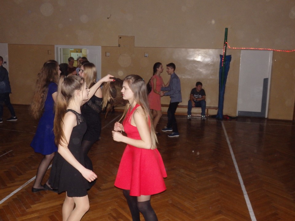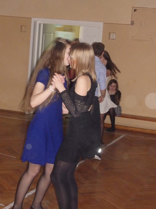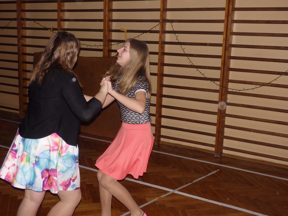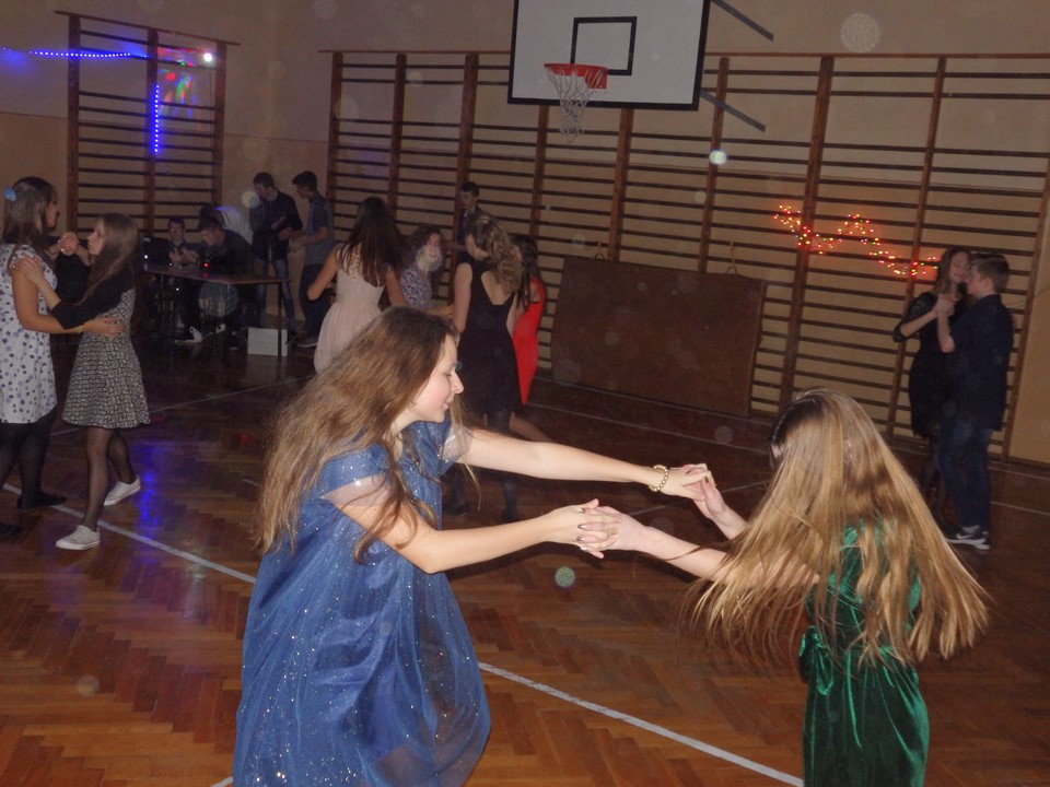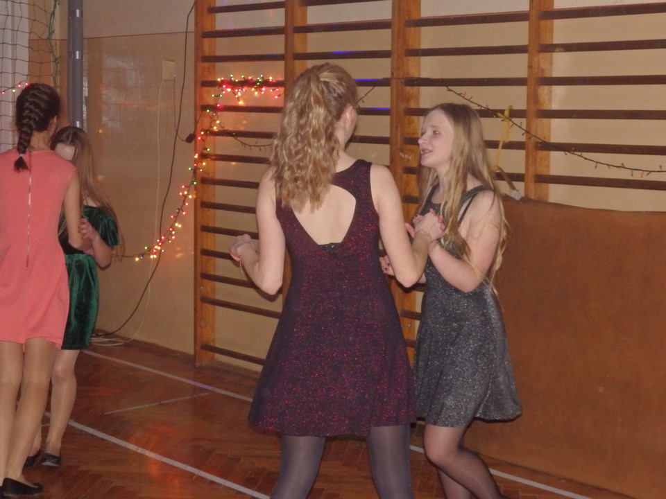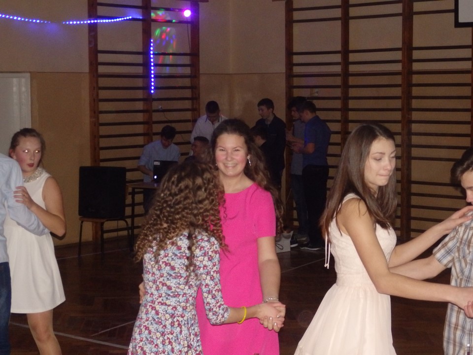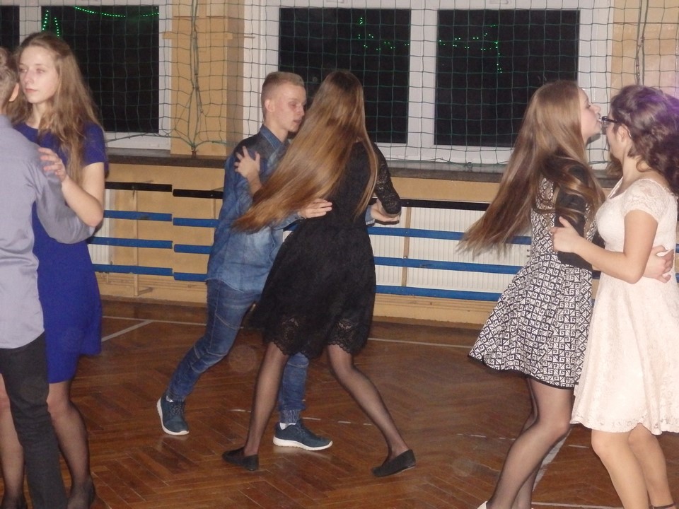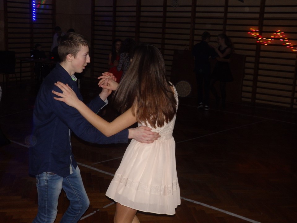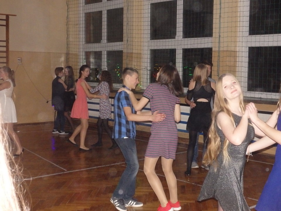Sobotni wieczór gimnazjaliści spędzili w szkole. Było wesoło, radośnie. Młodzież świetnie bawiła się na parkiecie sali gimnastycznej. Rodzice przygotowali dla nich słodki poczęstunek.