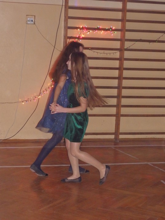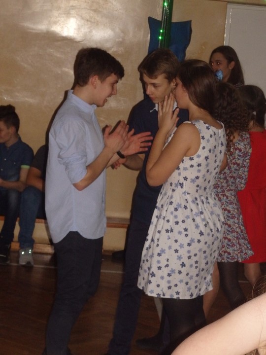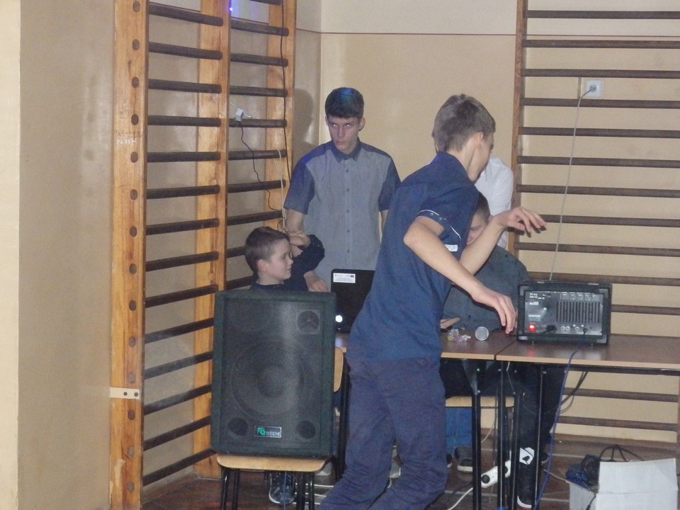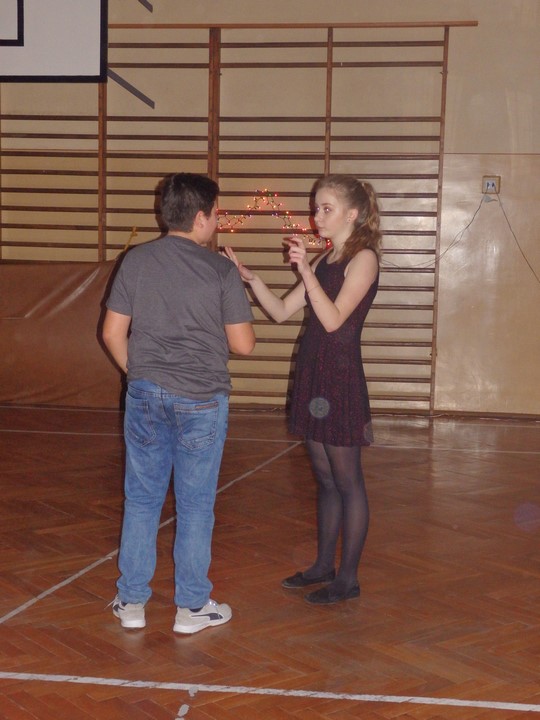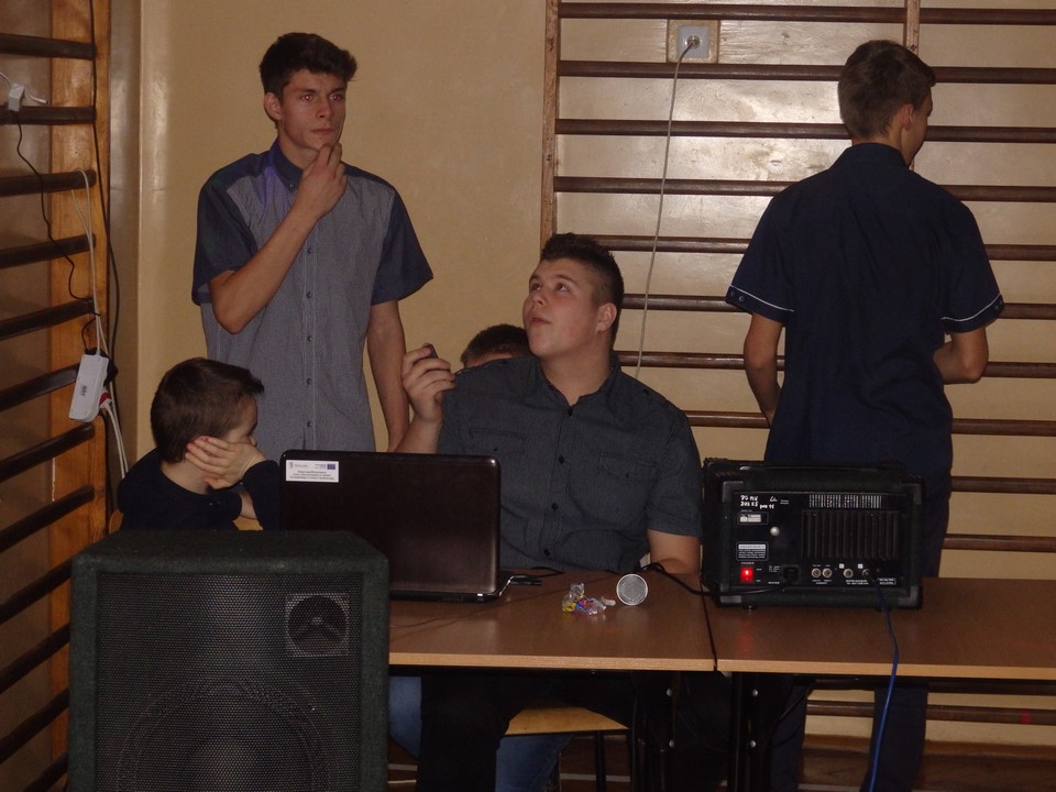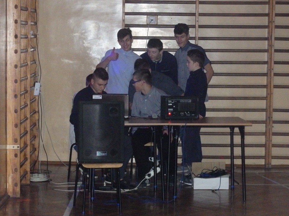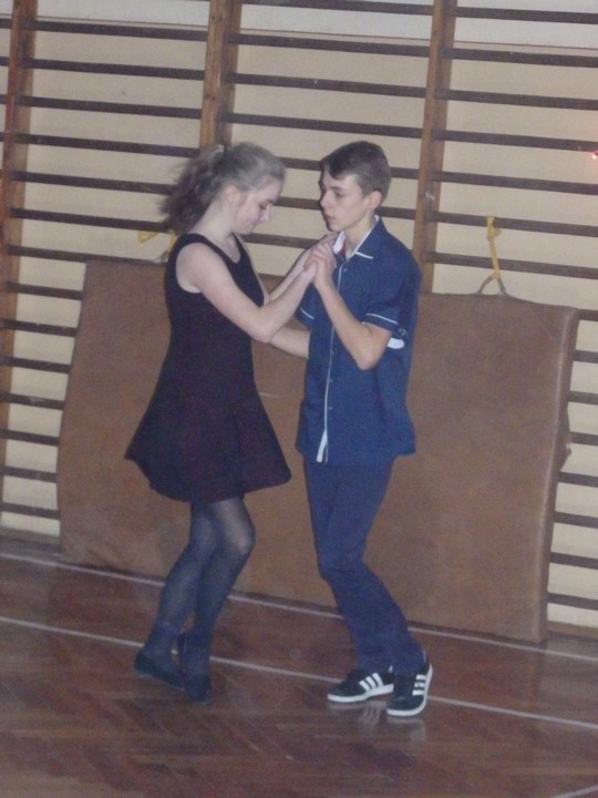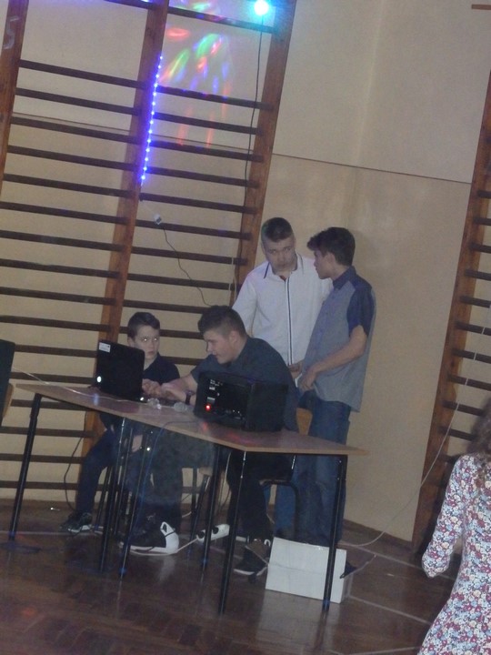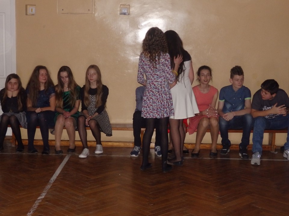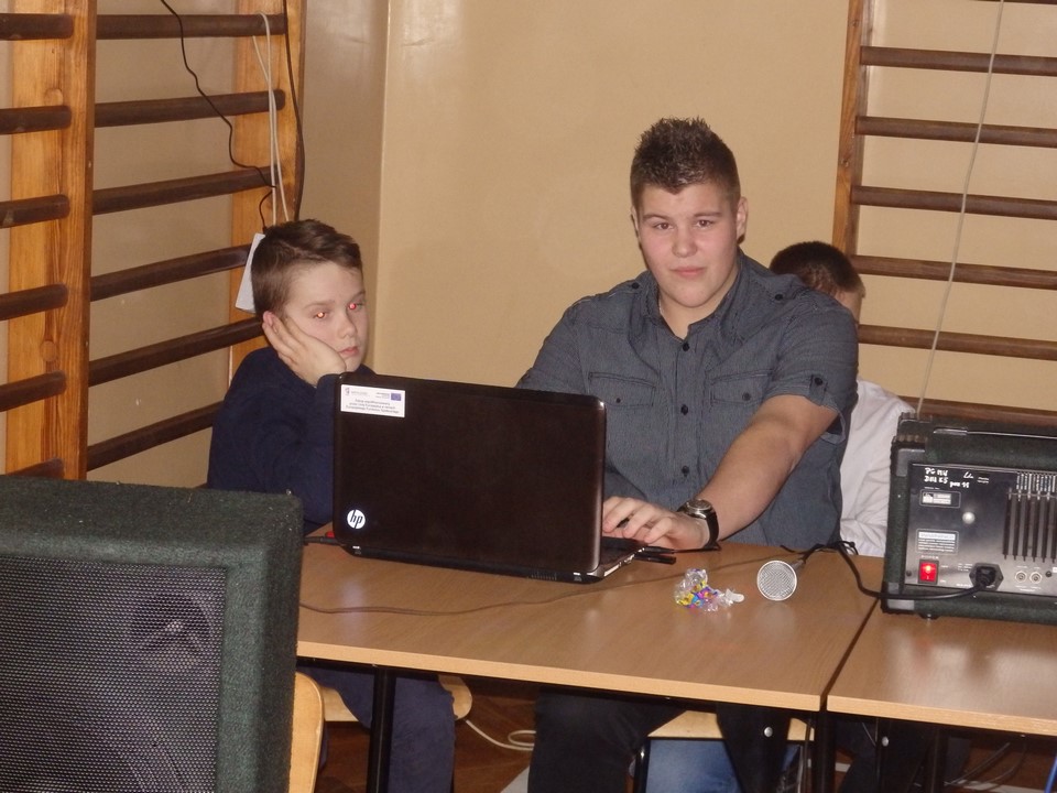 Sobotni wieczór gimnazjaliści spędzili w szkole. Było wesoło, radośnie. Młodzież świetnie bawiła się na parkiecie sali gimnastycznej. Rodzice przygotowali dla nich słodki poczęstunek.