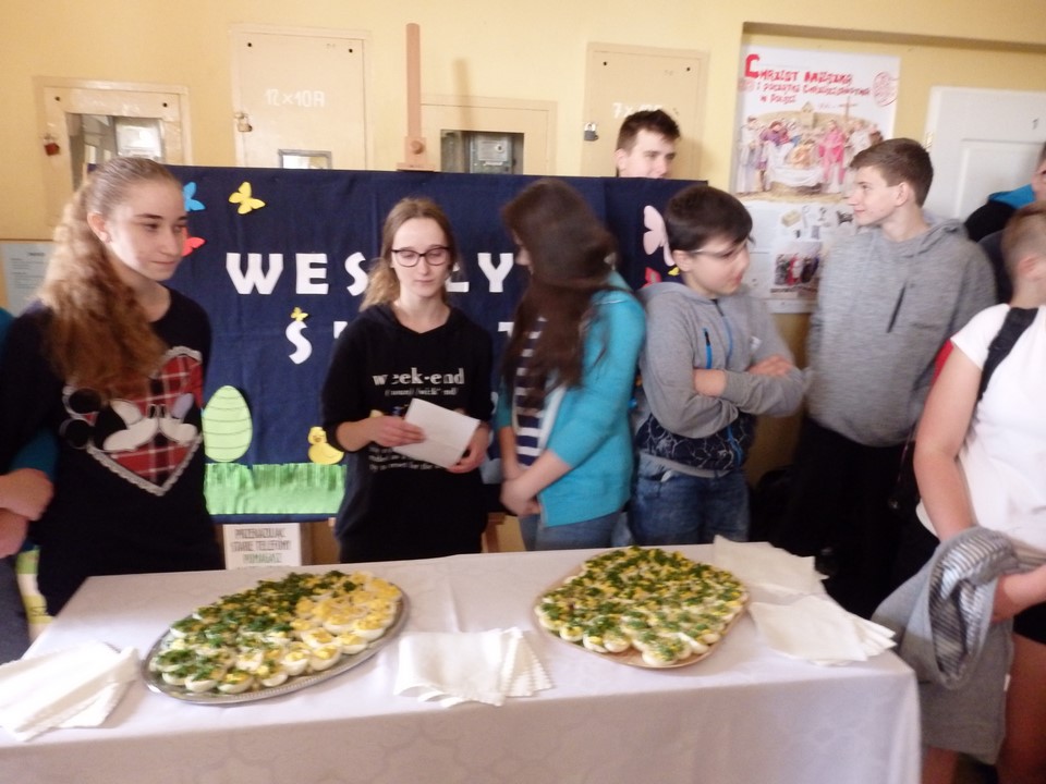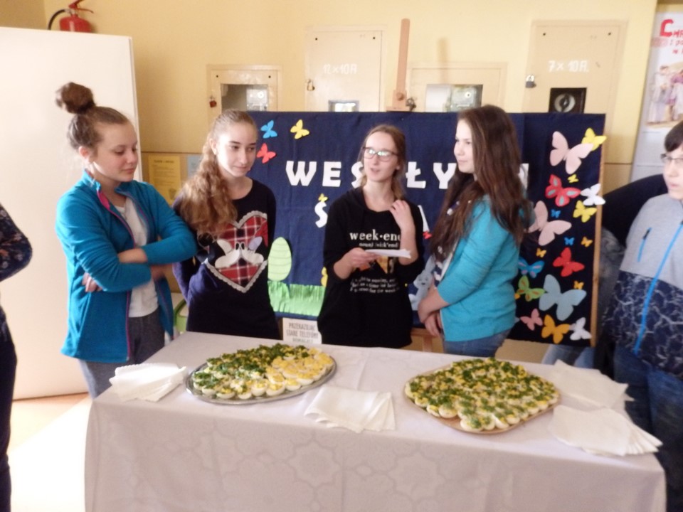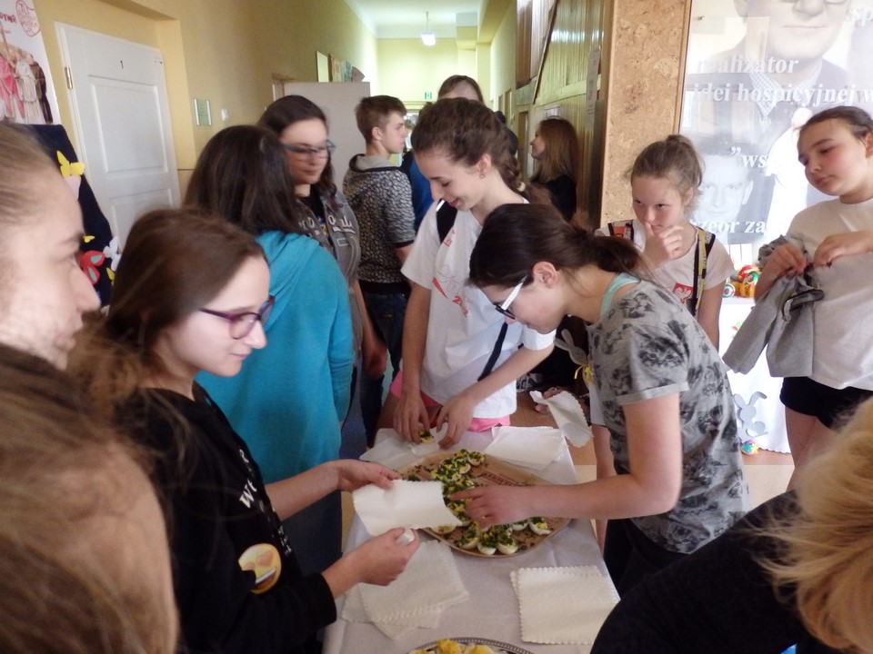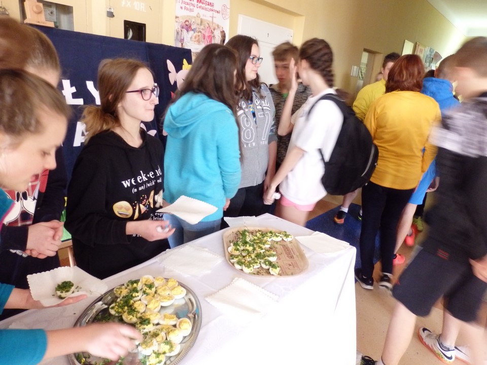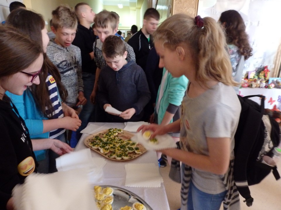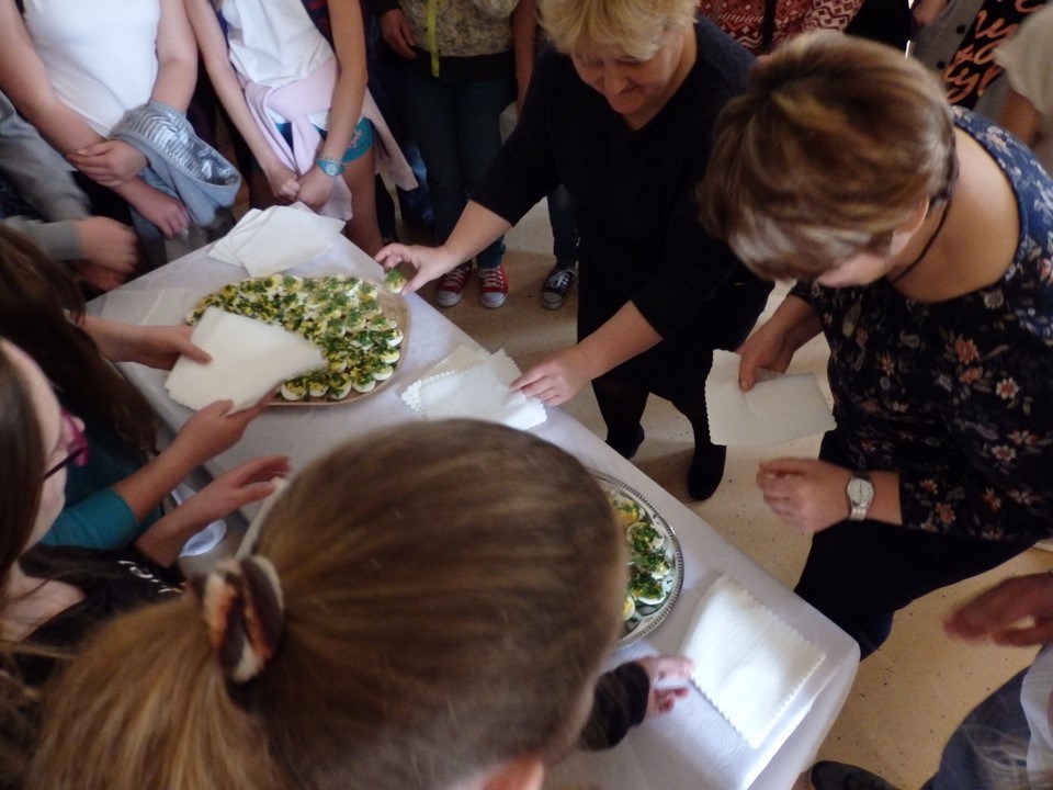 Jajko jest symbolem nowego życia. Z okazji świąt Wielkiej Nocy gimnazjaliści przygotowali dla swoich nauczycieli i kolegów świąteczne życzenia, kolorowe pisanki, a przede wszystkim faszerowane jajka.