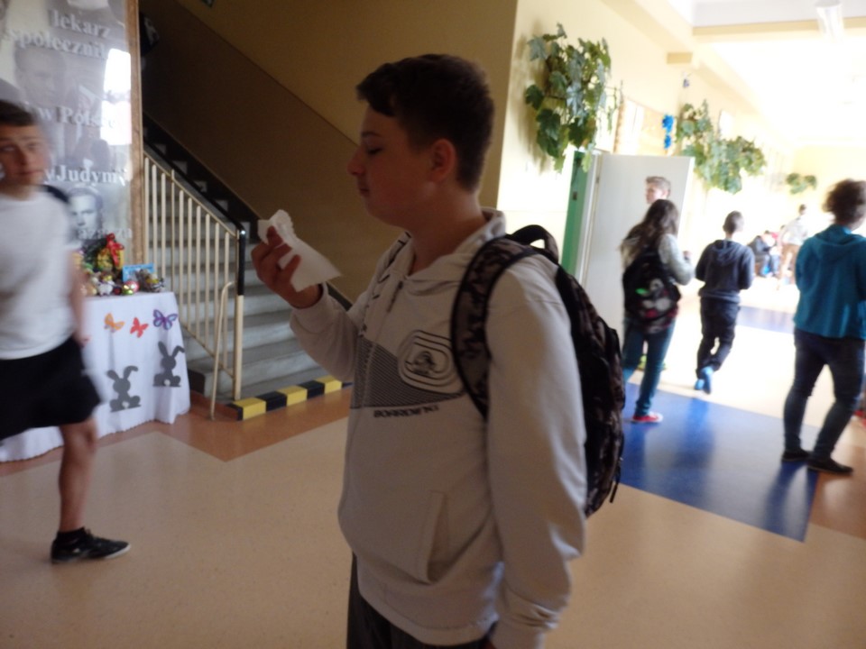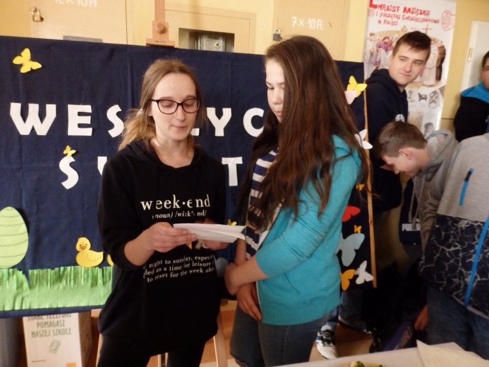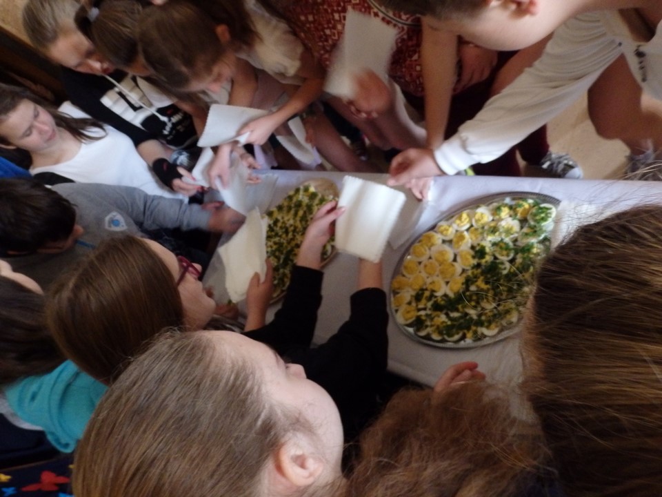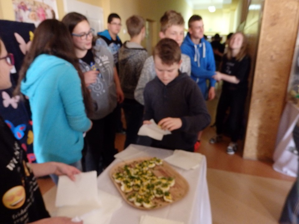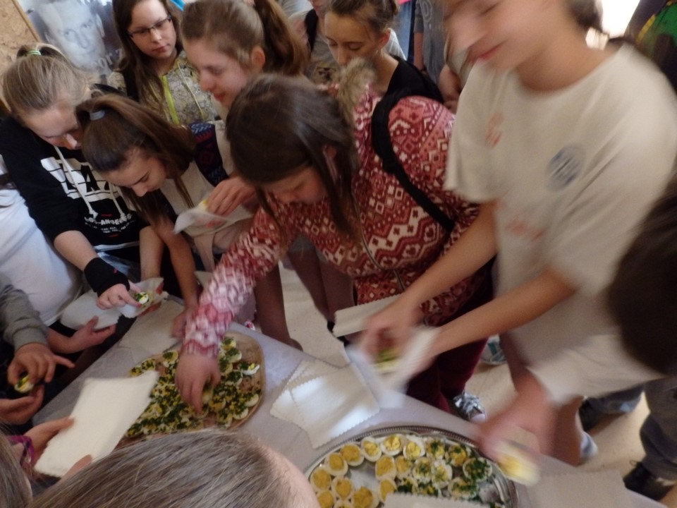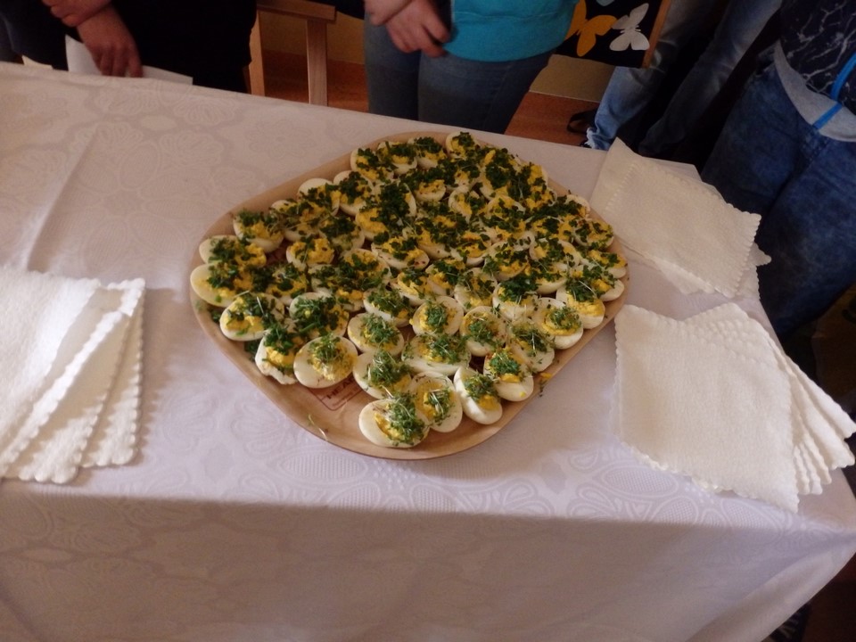 Jajko jest symbolem nowego życia. Z okazji świąt Wielkiej Nocy gimnazjaliści przygotowali dla swoich nauczycieli i kolegów świąteczne życzenia, kolorowe pisanki, a przede wszystkim faszerowane jajka.