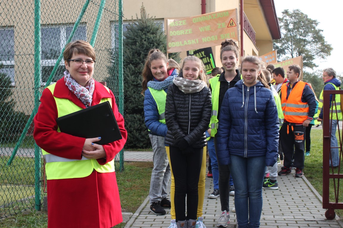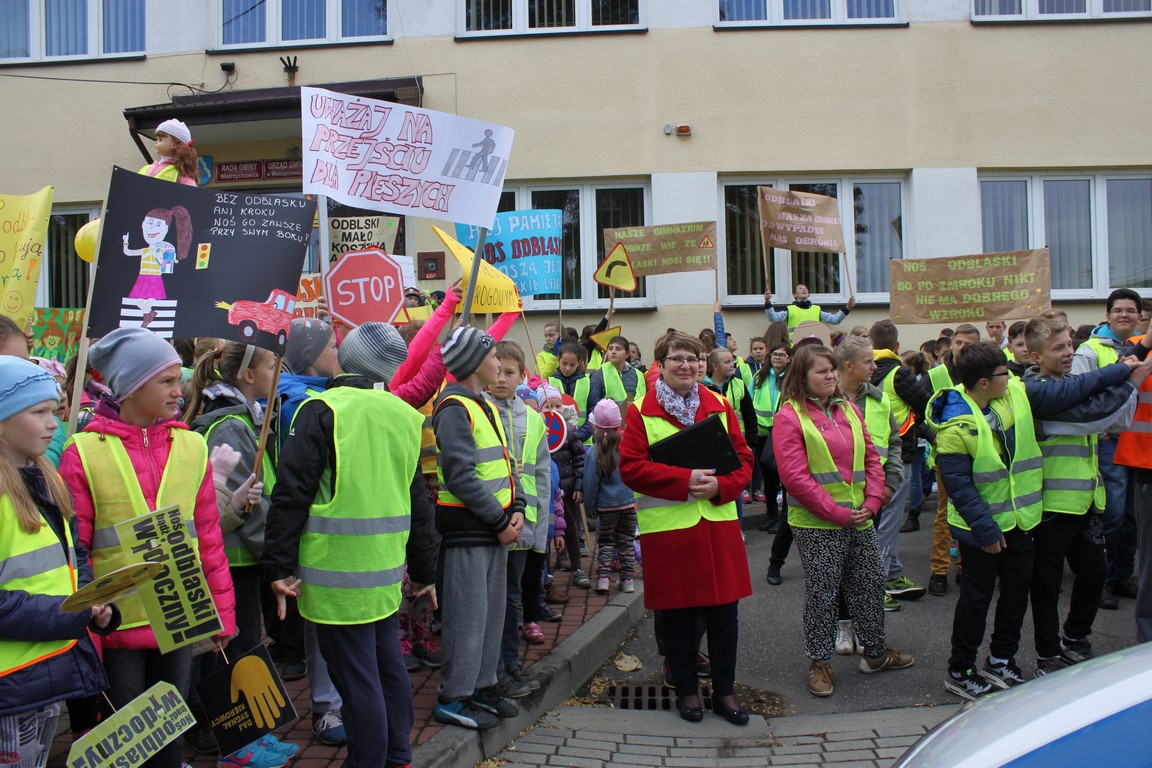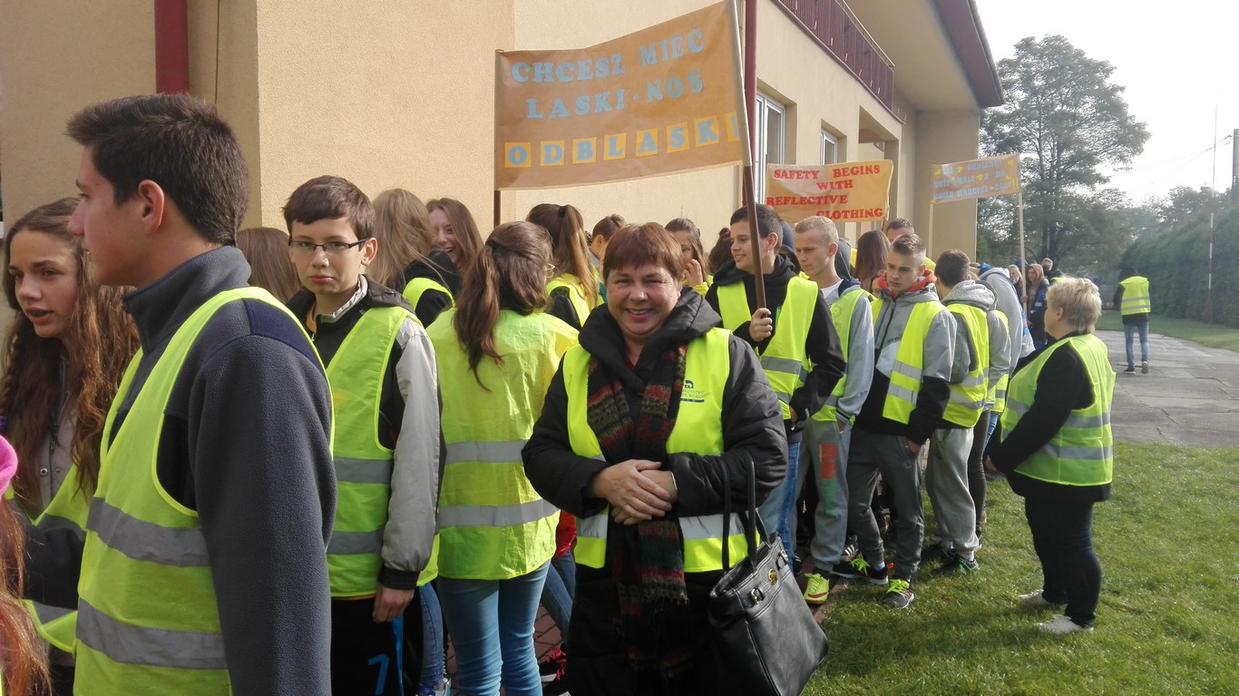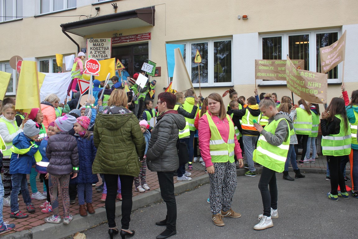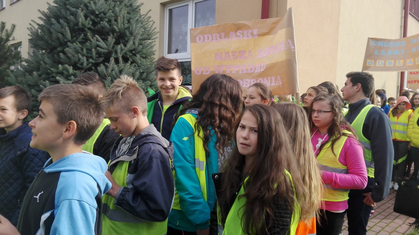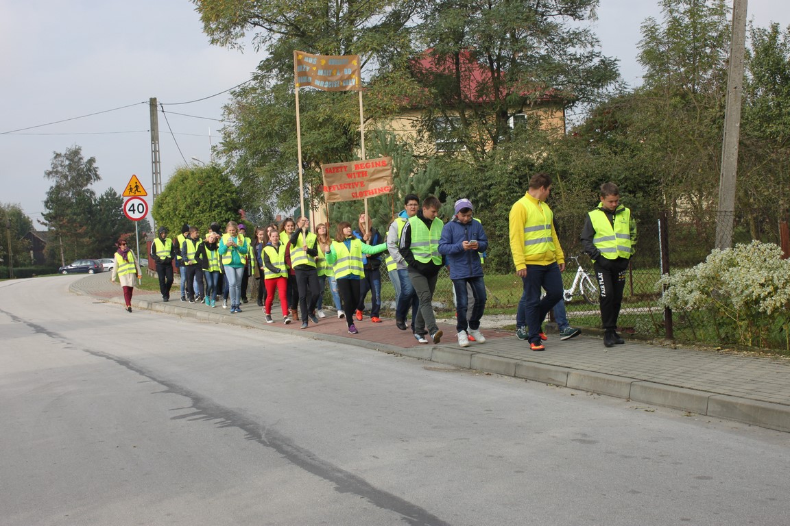 W naszej szkole bardzo troszczymy się o bezpieczeństwo uczniów, nie tylko w szkole, ale również na drodze. Chcąc przybliżyć mieszkańcom naszej gminy ideę noszenia odblasków wspólnie ze Szkołą Podstawową w Wietrzychowicach organizujemy Happening. Wszyscy ubrani w odblaskowe kamizelki pod ochroną policji przechodzimy pod budynek Urzędu Gminy Wietrzychowice skandując hasła zachęcające do noszenia odblasków. Spotykamy się tam z przedstawicielami władz gminnych oraz policji. Po krótkiej pogadance i rozstrzygnięciu konkursu na najlepsze hasło zachęcające do noszenia odblasków wracamy do szkoły.