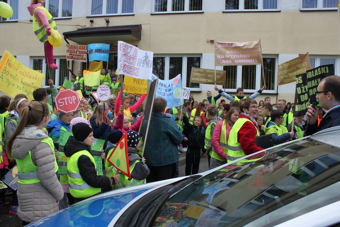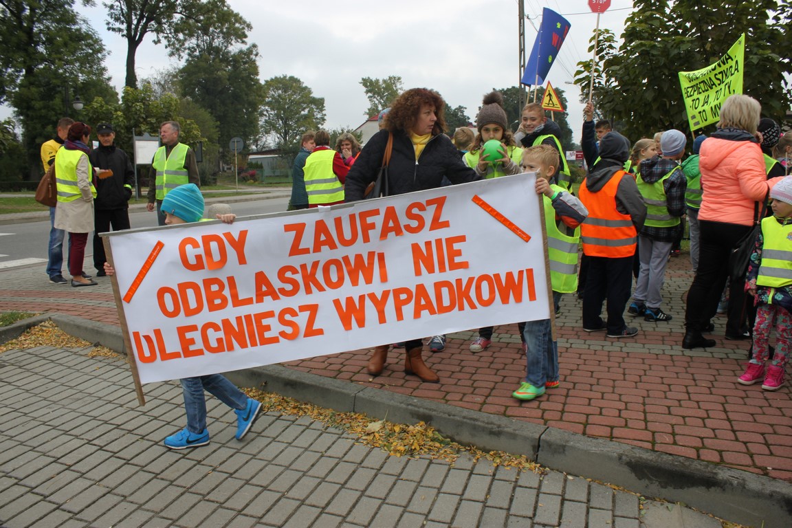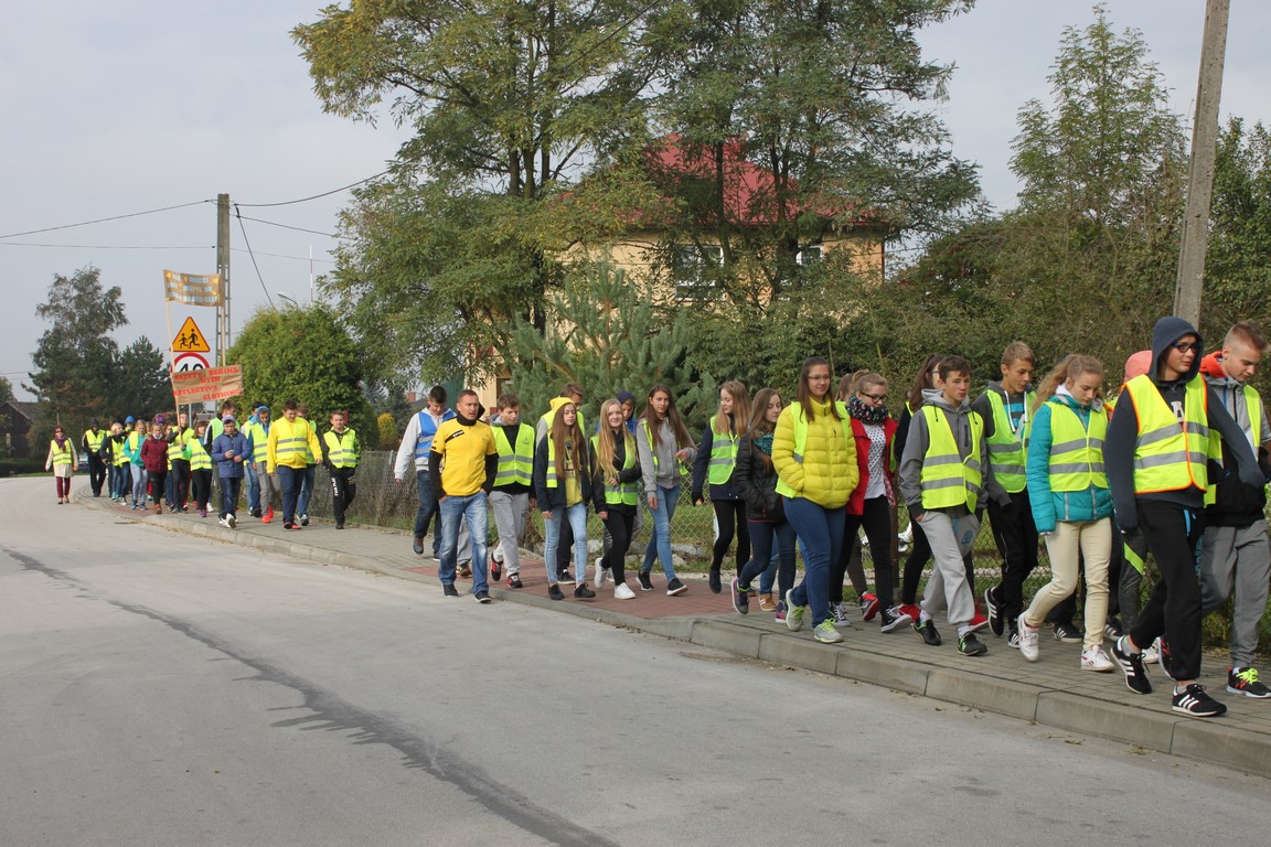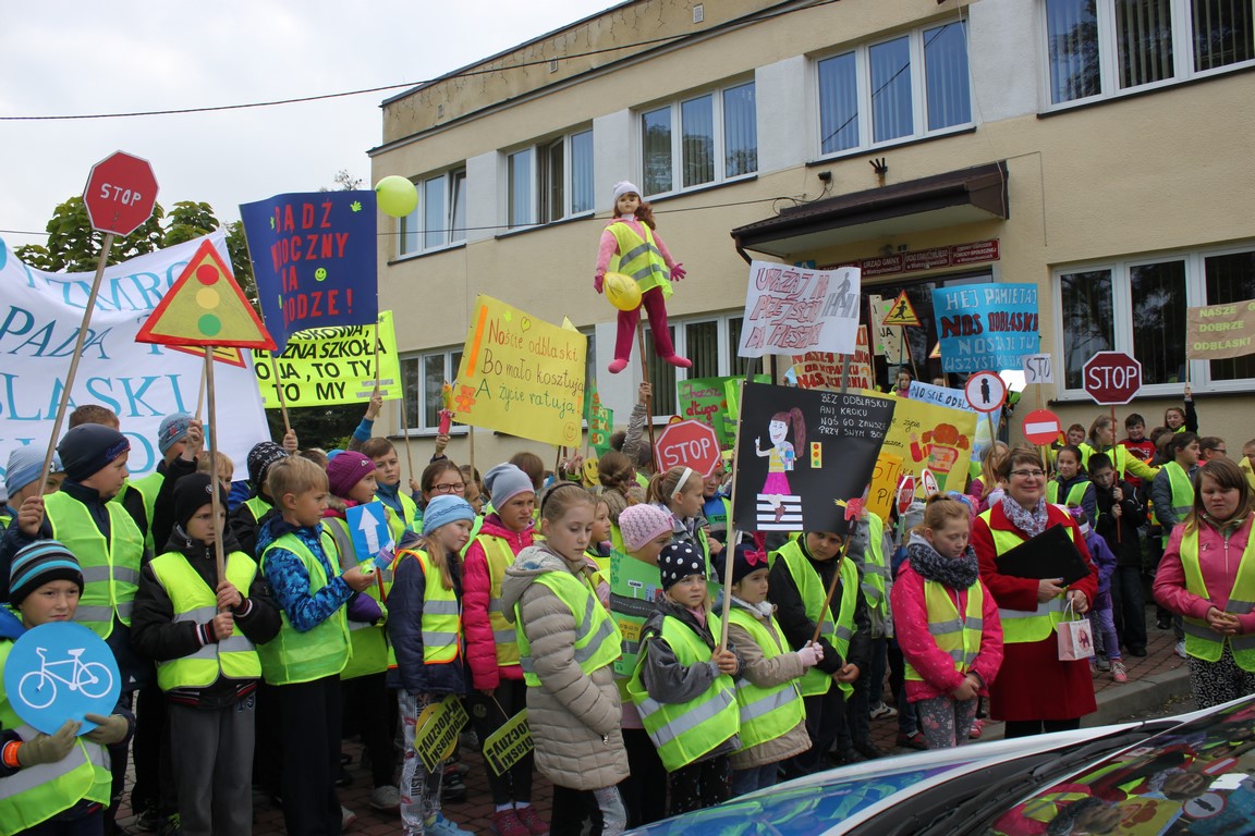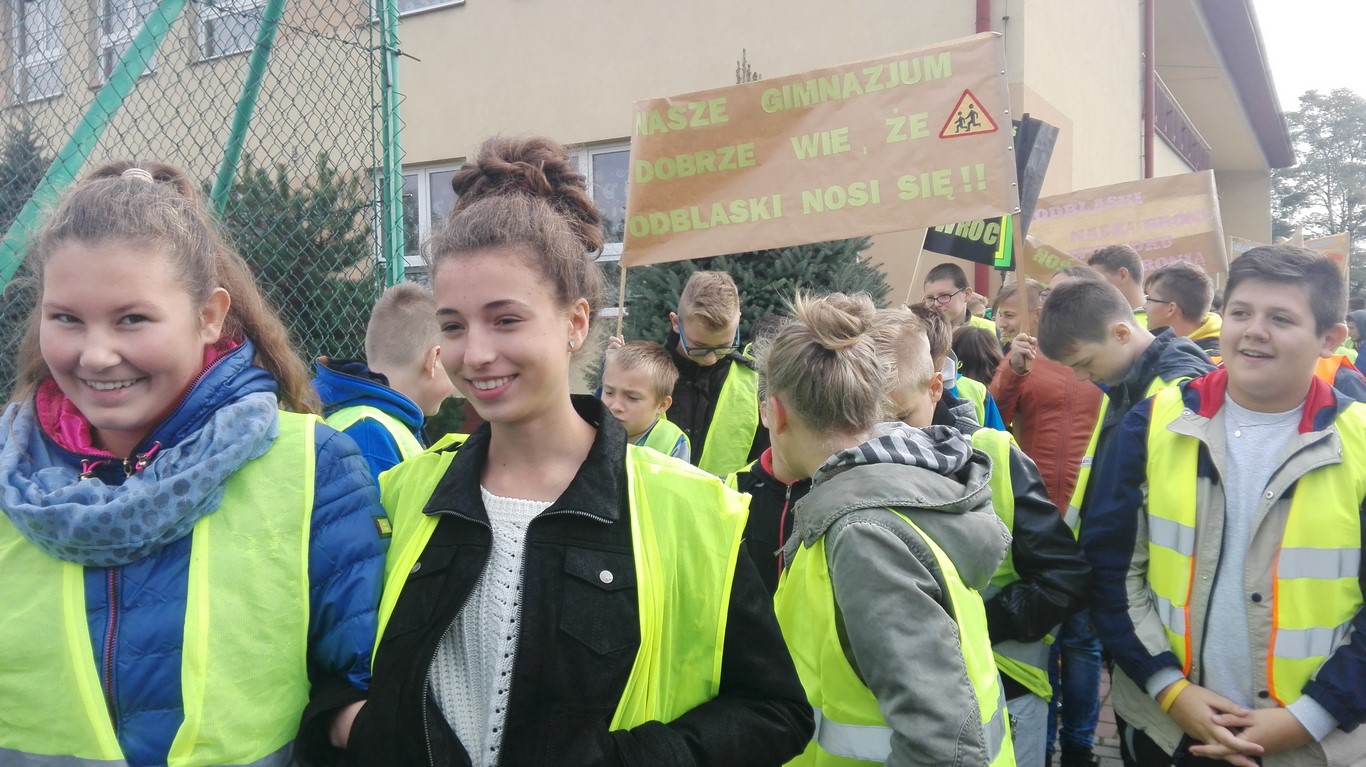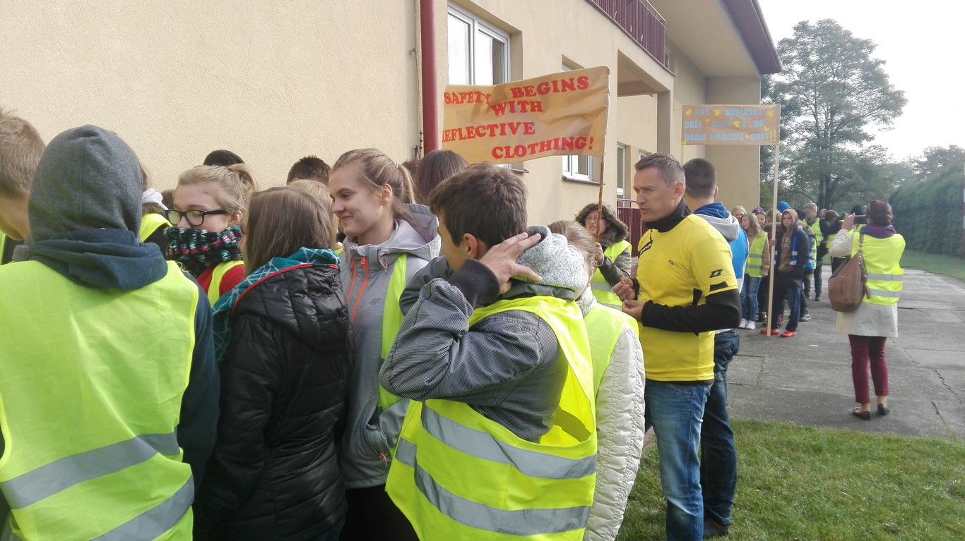 W naszej szkole bardzo troszczymy się o bezpieczeństwo uczniów, nie tylko w szkole, ale również na drodze. Chcąc przybliżyć mieszkańcom naszej gminy ideę noszenia odblasków wspólnie ze Szkołą Podstawową w Wietrzychowicach organizujemy Happening. Wszyscy ubrani w odblaskowe kamizelki pod ochroną policji przechodzimy pod budynek Urzędu Gminy Wietrzychowice skandując hasła zachęcające do noszenia odblasków. Spotykamy się tam z przedstawicielami władz gminnych oraz policji. Po krótkiej pogadance i rozstrzygnięciu konkursu na najlepsze hasło zachęcające do noszenia odblasków wracamy do szkoły.