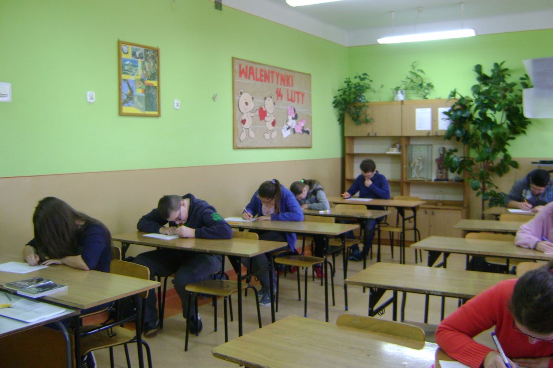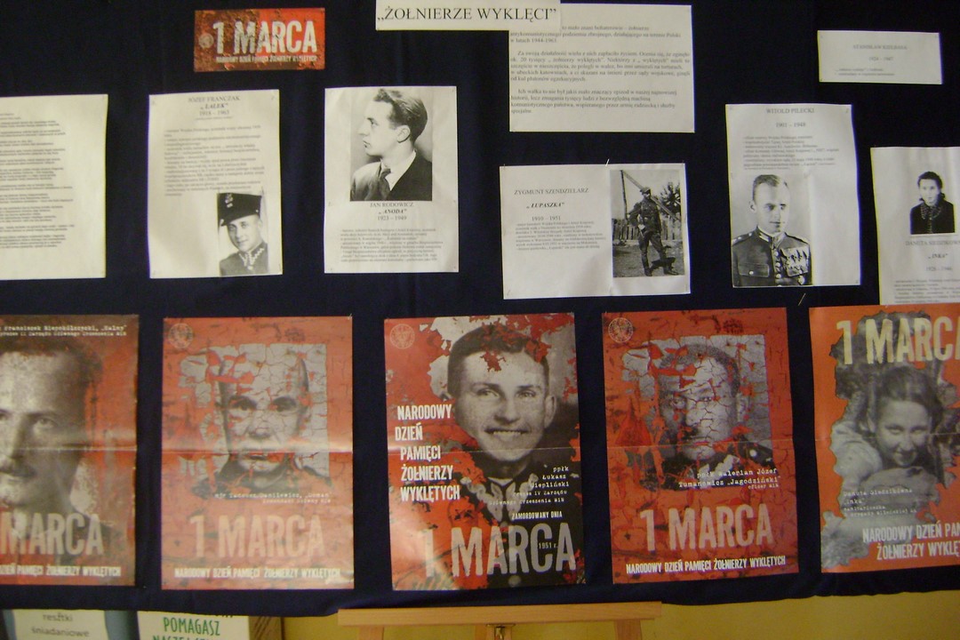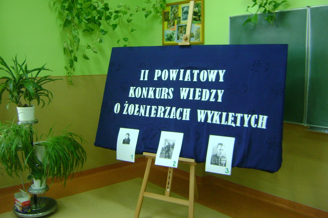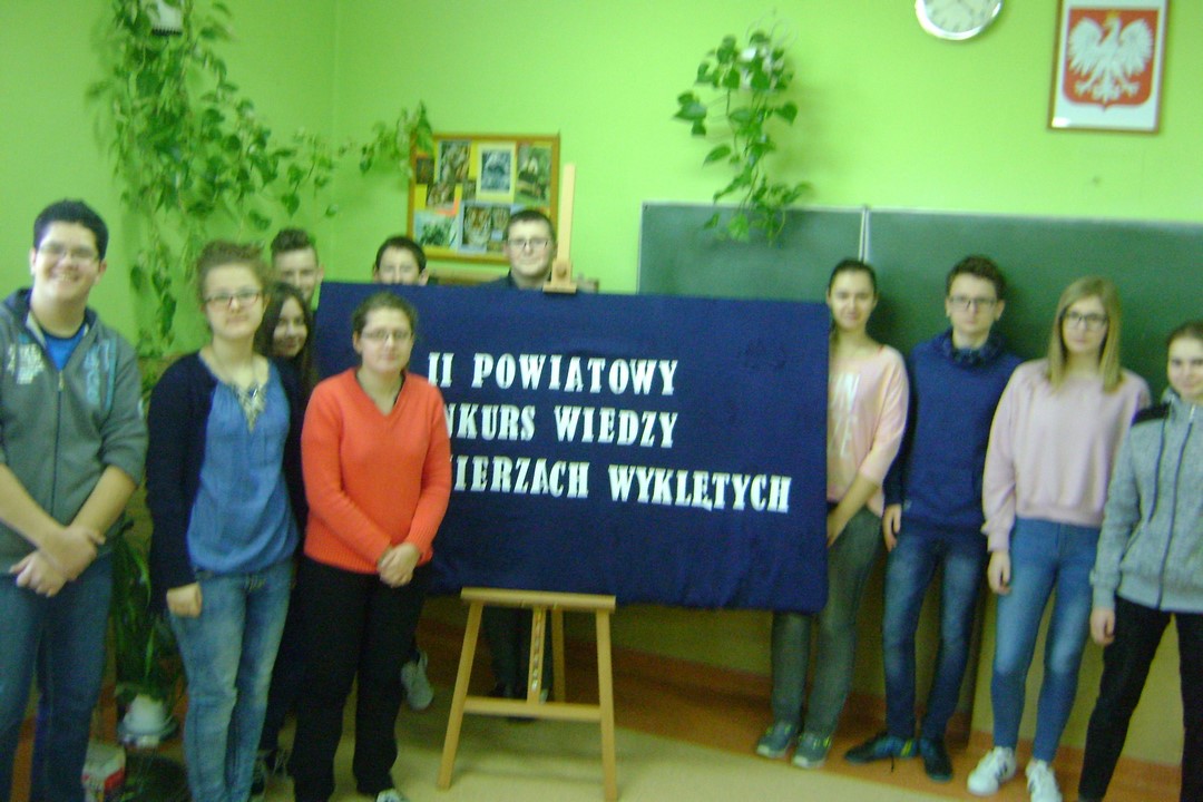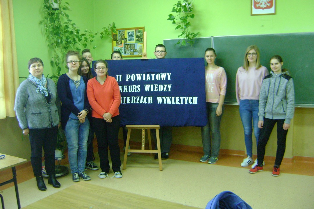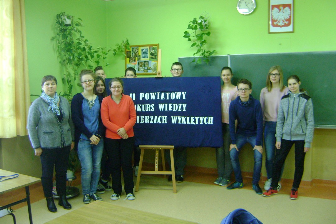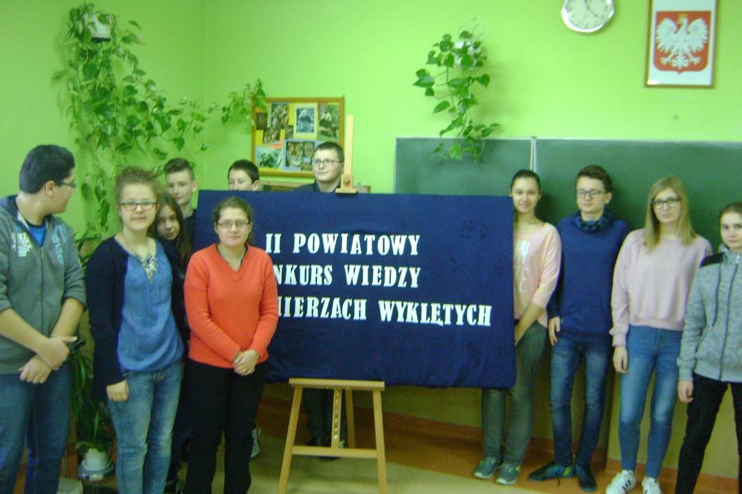 27 lutego uczniowie klas trzecich wzięli udział w okolicznościowej lekcji historii: O wolnej Polsce zawsze śnili … – w hołdzie „żołnierzom wyklętym”, którą przygotowała nauczycielka historii Iwona Wojciechowska. Gimnazjaliści obejrzeli także film pt. „Historia Roja, czyli w ziemi słychać lepiej” inspirowany losami jednego z bohaterów podziemia niepodległościowego po 1945 r., Mieczysława Dziemieszkiewicza pseudonim „Rój”. Po projekcji filmowej odbył się etap szkolny II Powiatowego Konkursu Wiedzy o Żołnierzach Wyklętych. W konkursie wzięło udział 14 uczniów naszej szkoły. Do etapu powiatowego zakwalifikowali się: Emilia Wojciechowska i Tomasz Pieczonka z klasy 3b oraz Kinga Kozłowska z klasy 3a.