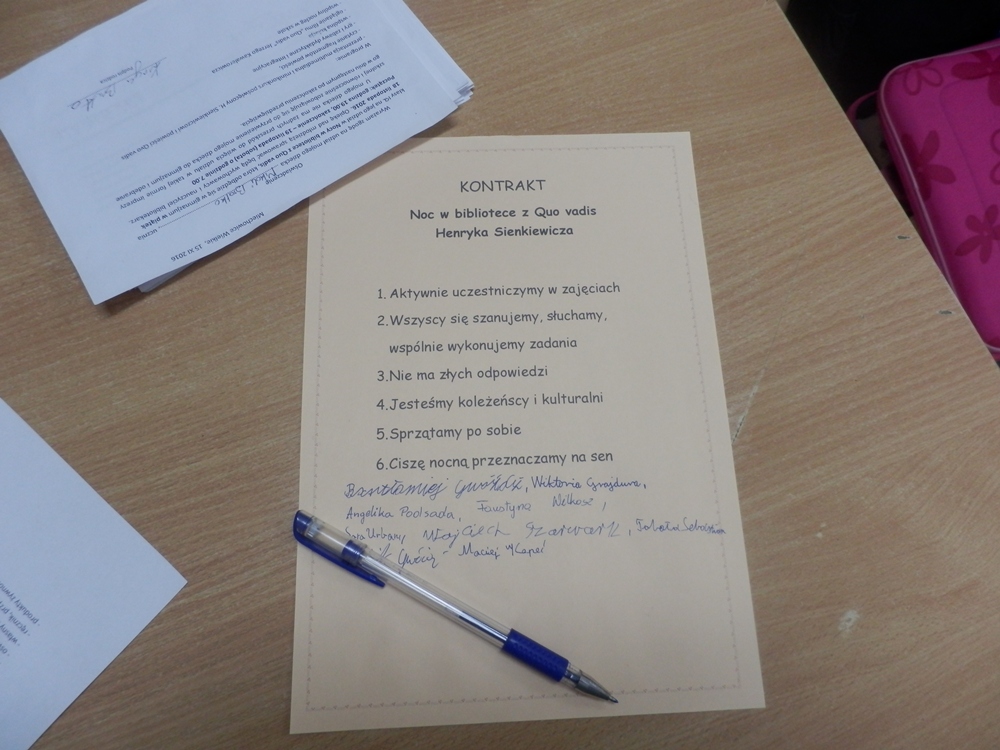 W kończącym się właśnie Roku Henryka Sienkiewicza w szkole zorganizowane zostało jeszcze jedno przedsięwzięcie poszerzające wiedzę uczniów o tym pisarzu i jego literackim dorobku, ze szczególnym uwzględnieniem powieści „Quo vadis”. Zorganizowane zostało w konwencji ”nocy w bibliotece” i przeznaczone było dla uczniów klas pierwszych.