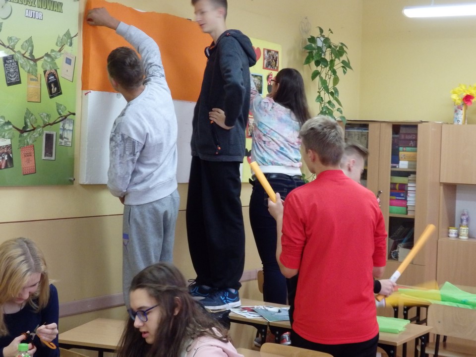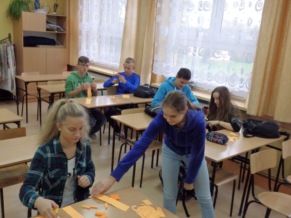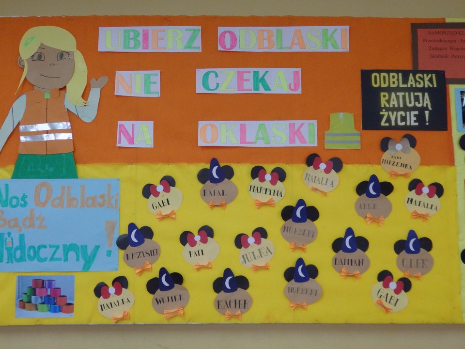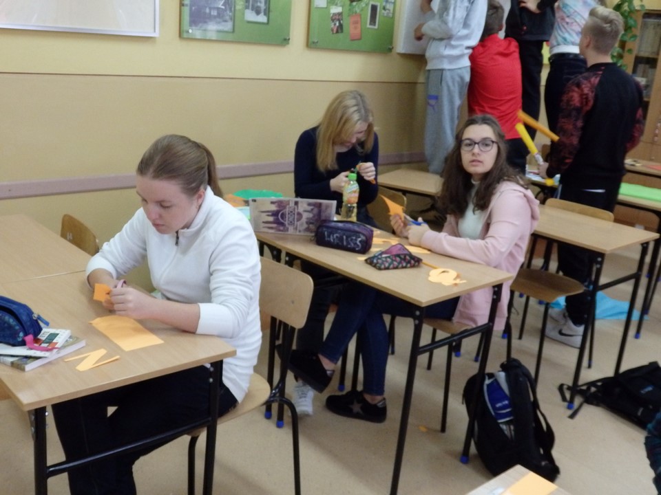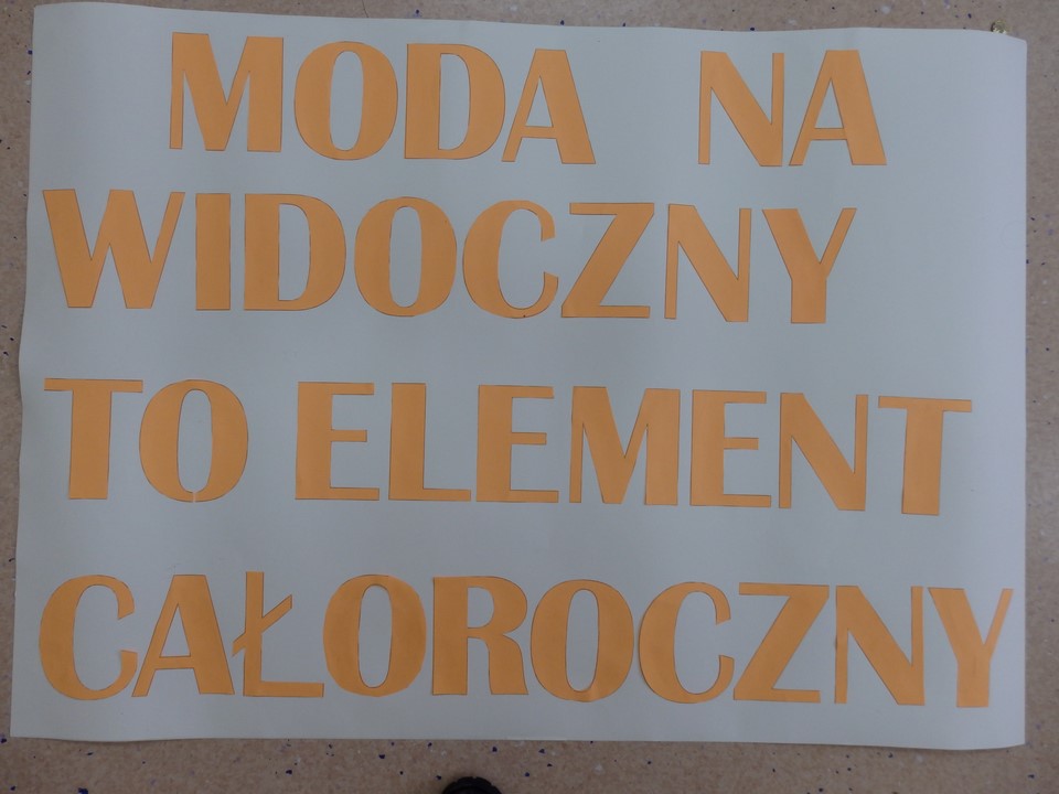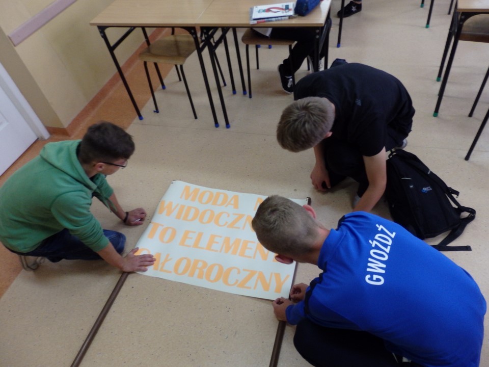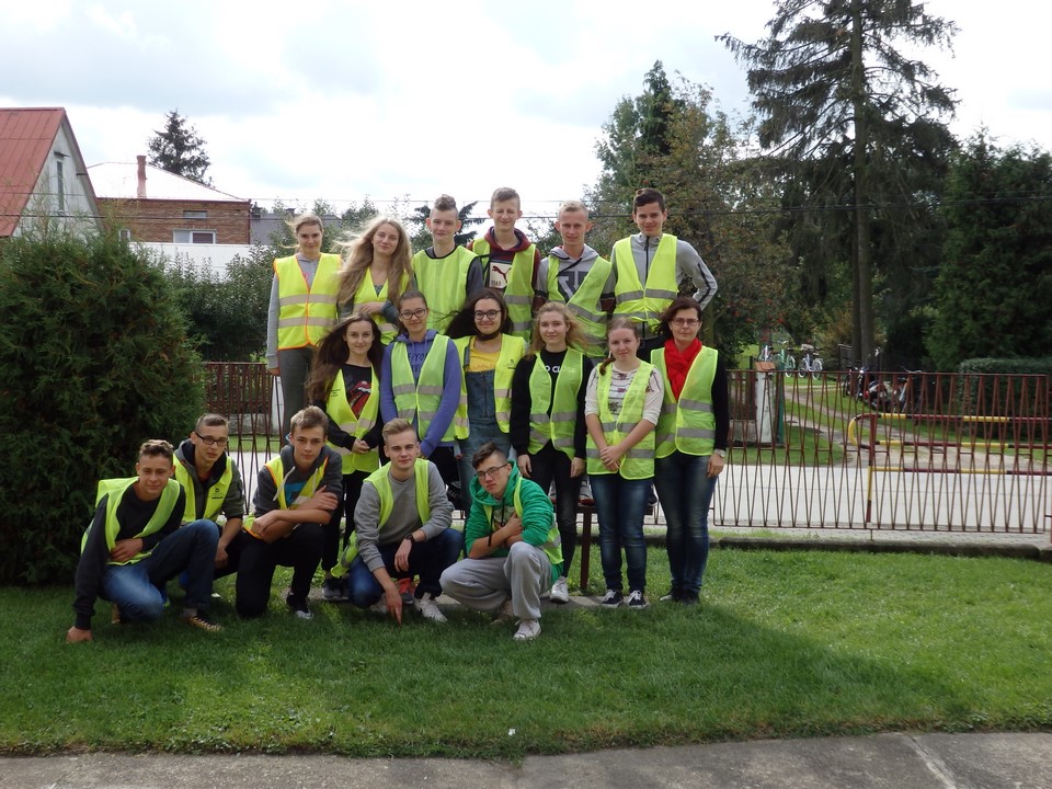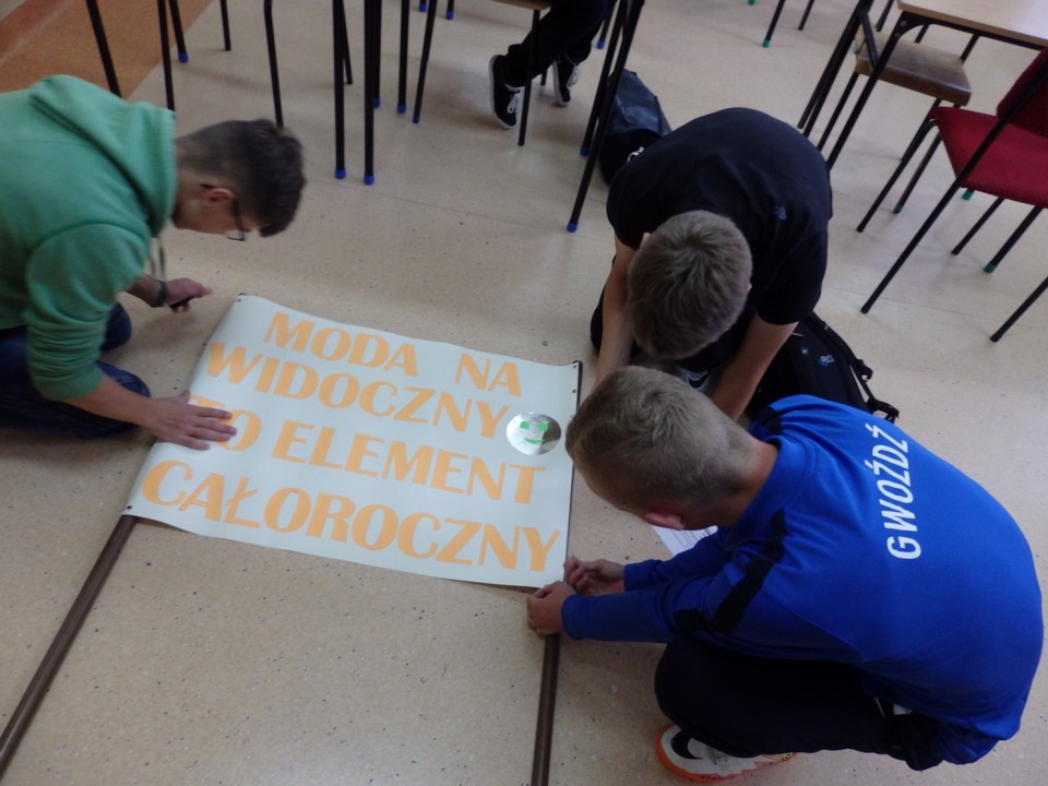 Klasa 3b gimnazjum wspólnie z wychowawczynią wykonała gazetkę ścienną dotyczącą bezpieczeństwa na drodze i noszenia przez młodzież kamizelek odblaskowych. Wszyscy również angażowali się podczas wykonywania transparentu na happening.