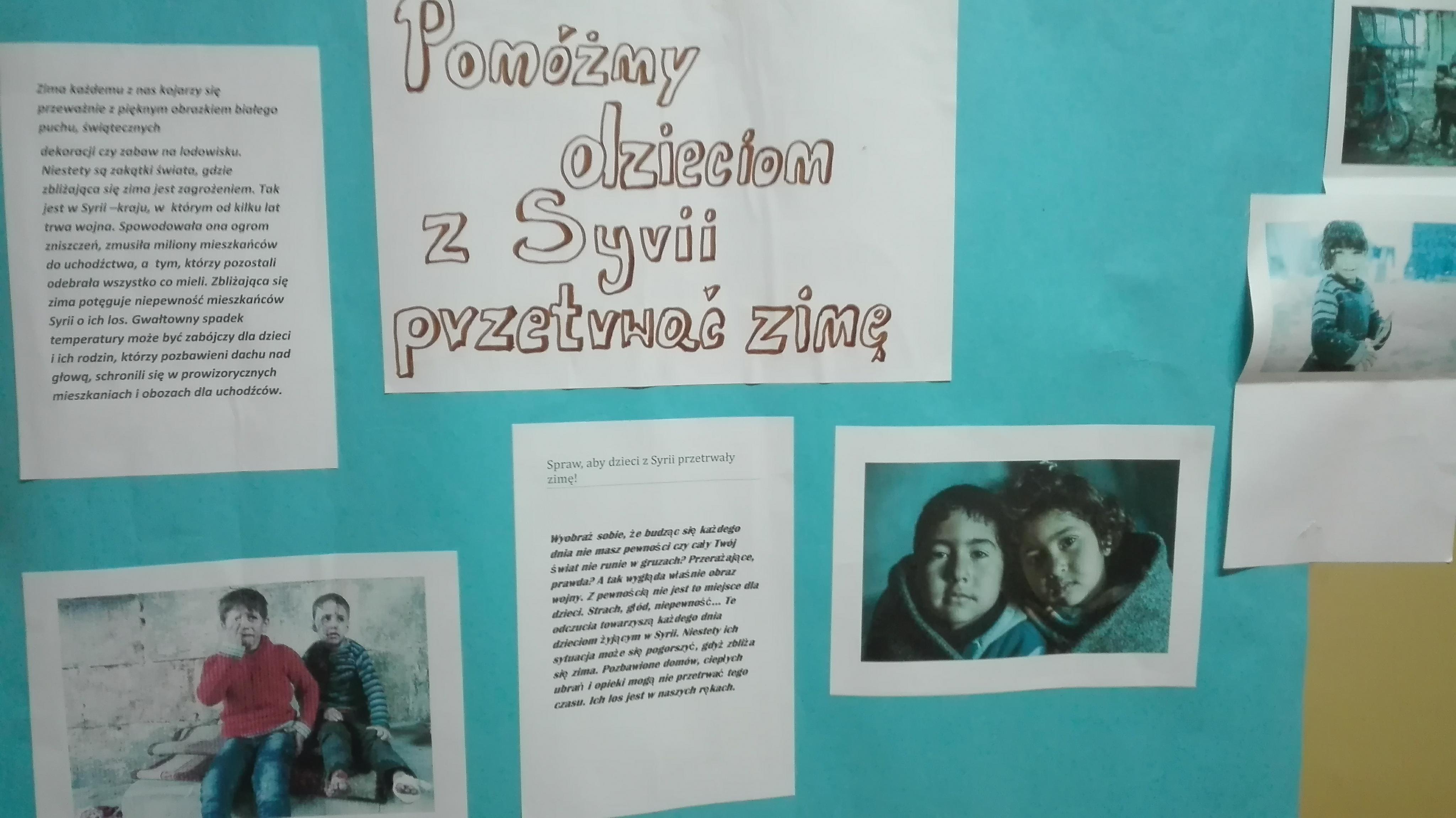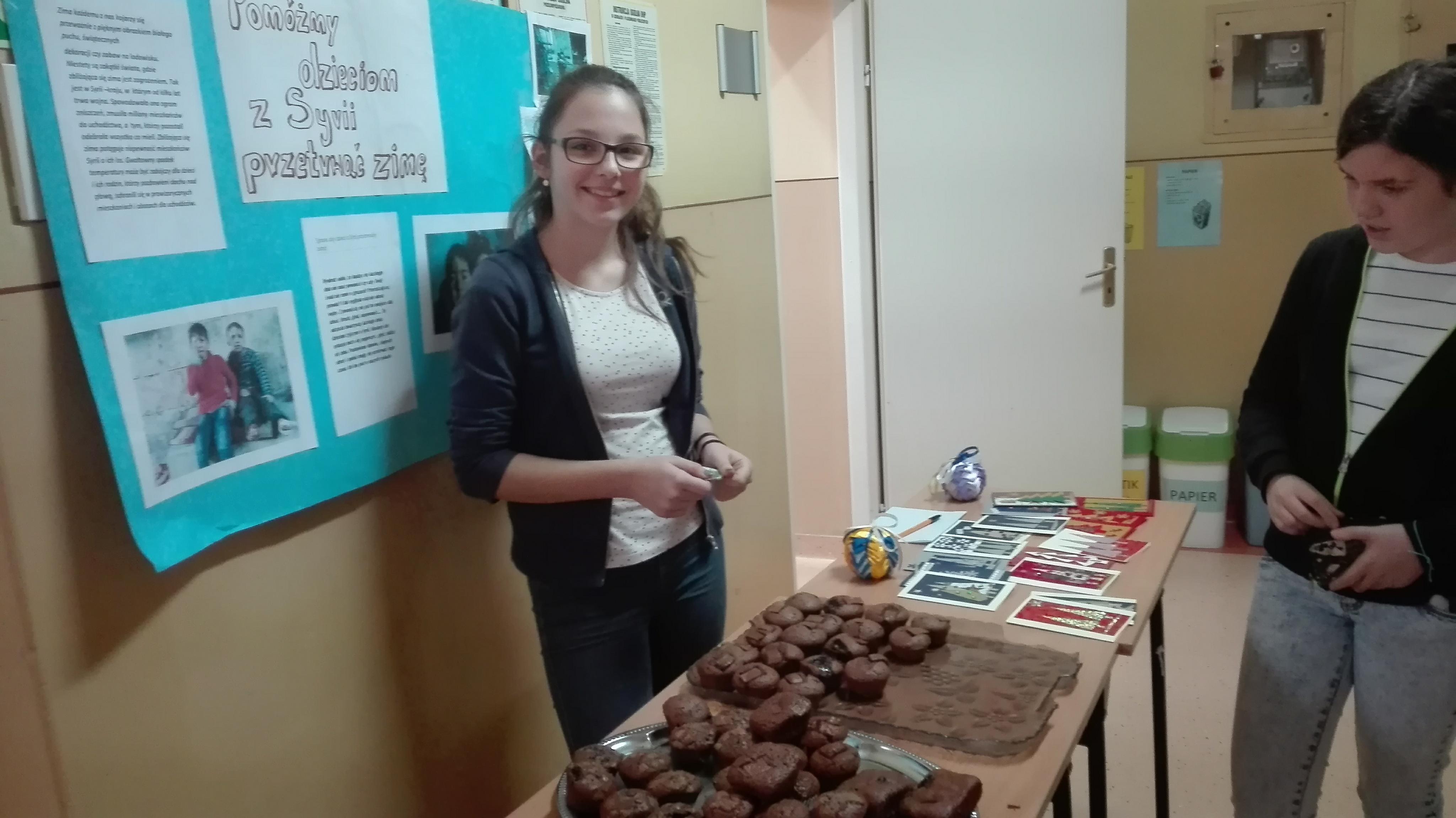 7 grudnia dziewczęta z Wolontariatu zorganizowały akcję, mającą na celu pomoc dzieciom z Syrii. Akcja była elementem większego przedsięwzięcia, które zostało przeprowadzone w szkole podstawowej. Uczennice przygotowały plakat informujący o sytuacji dzieci z Syrii oraz upiekły muffinki, które oczywiście rozeszły się w błyskawicznym tempie. Oprócz tego rozprowadzane były kartki świąteczne wykonane przez opiekunkę Koła Wolontariatu. Uzyskana kwota pieniężna została przekazana koordynatorom akcji „UNICEF – Pomoc dla Syrii”.