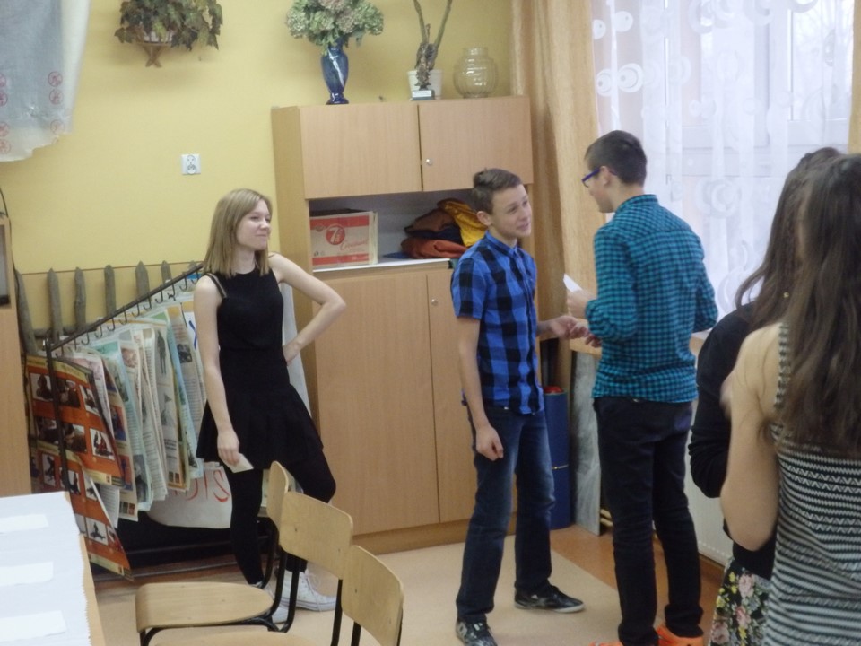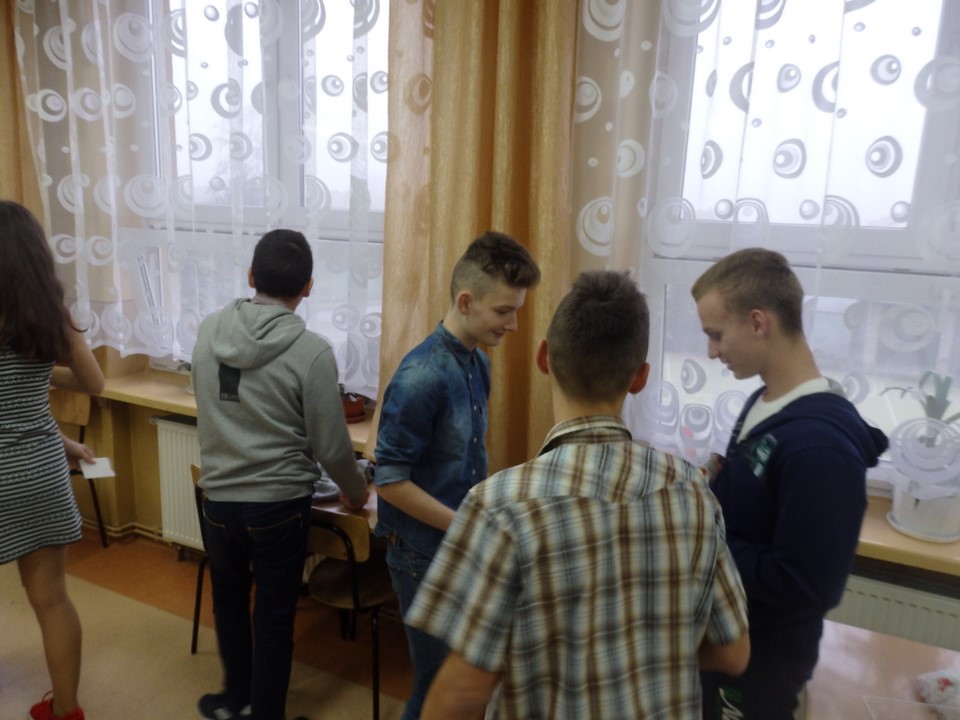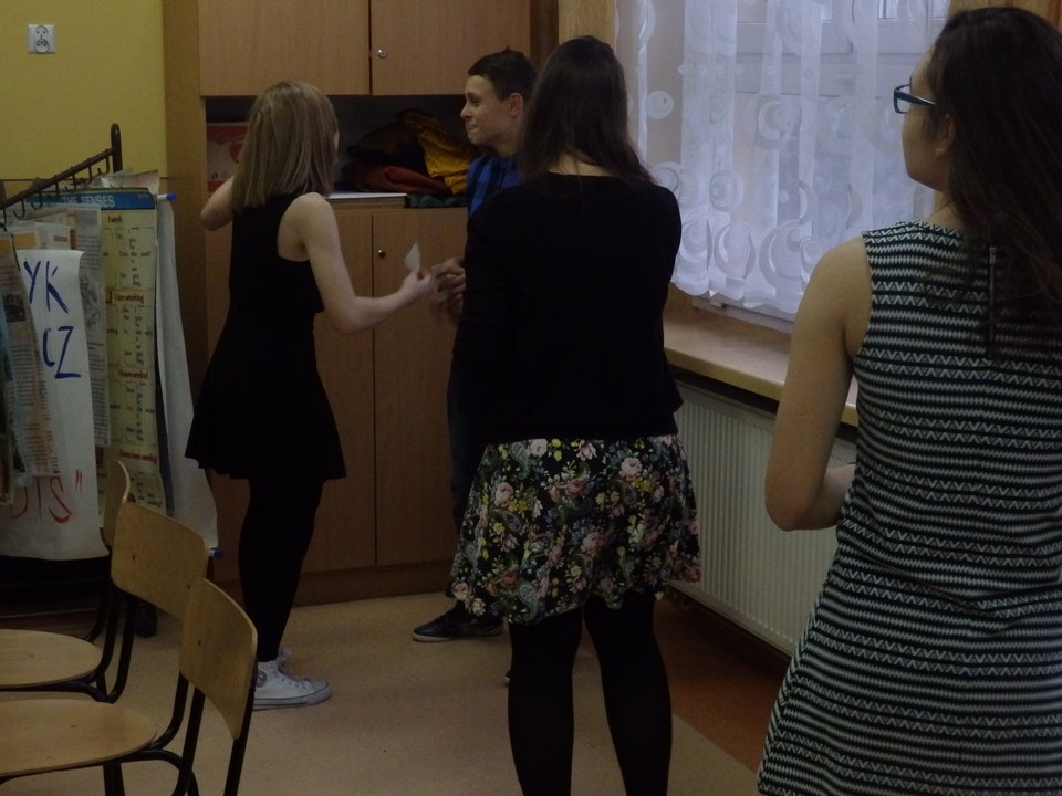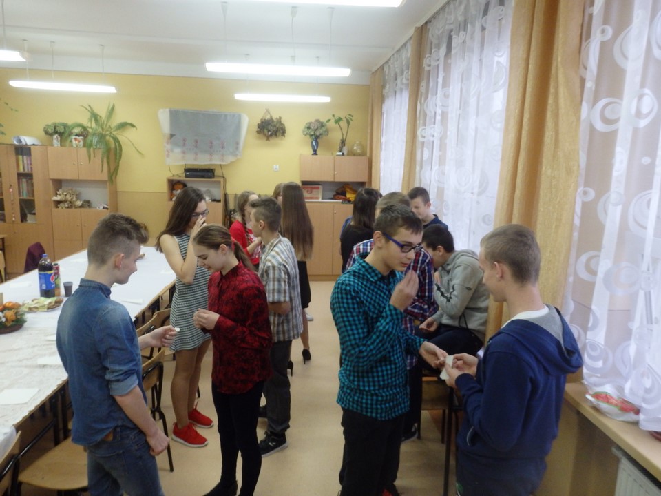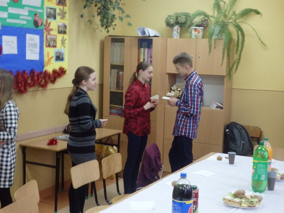 Uczniowie klasy 2b wraz z wychowawczynią w czasie klasowej wigilii.