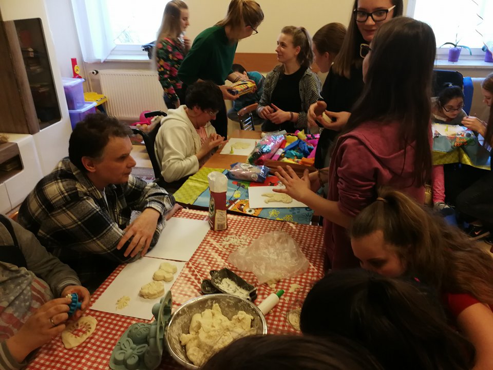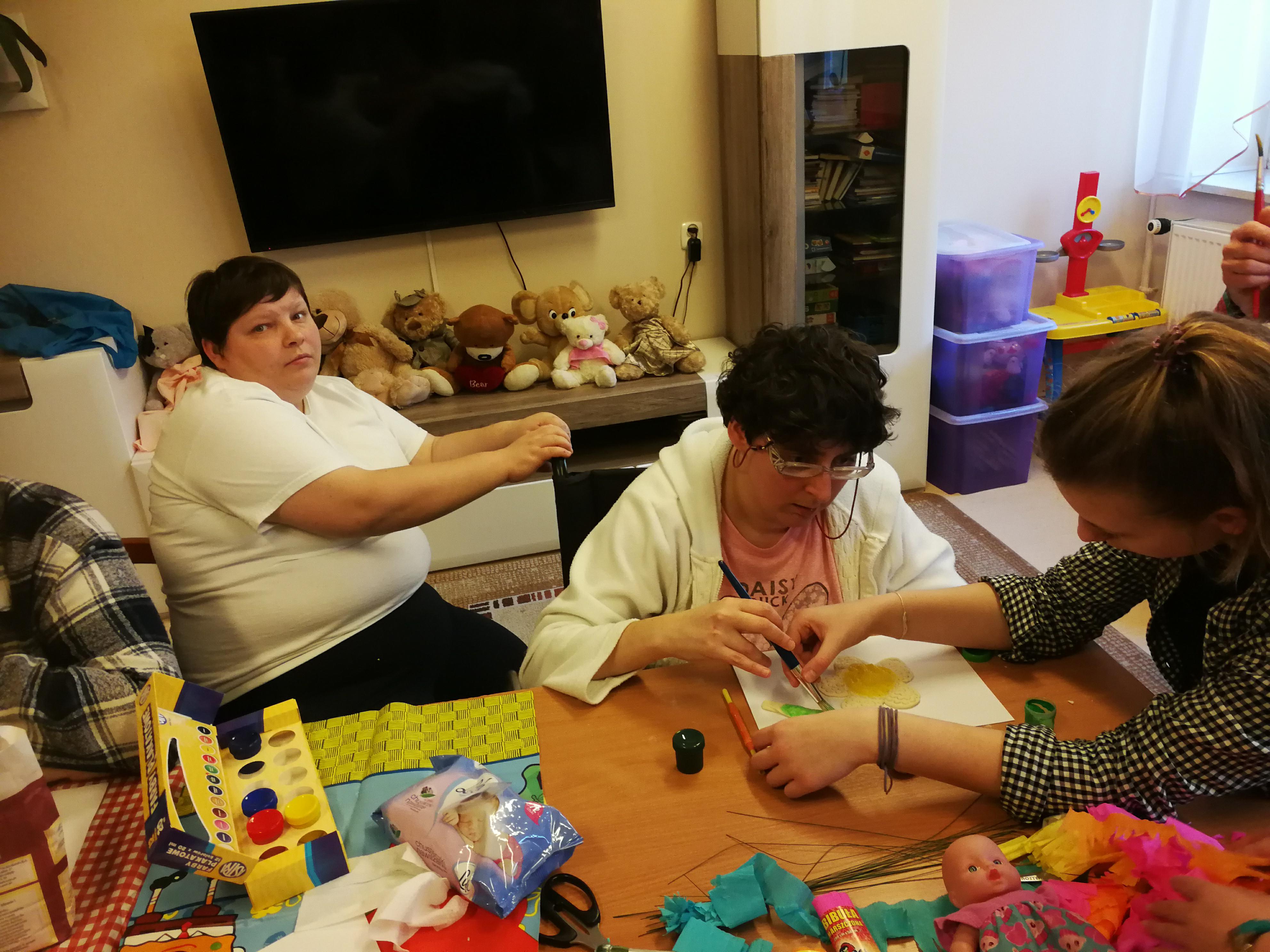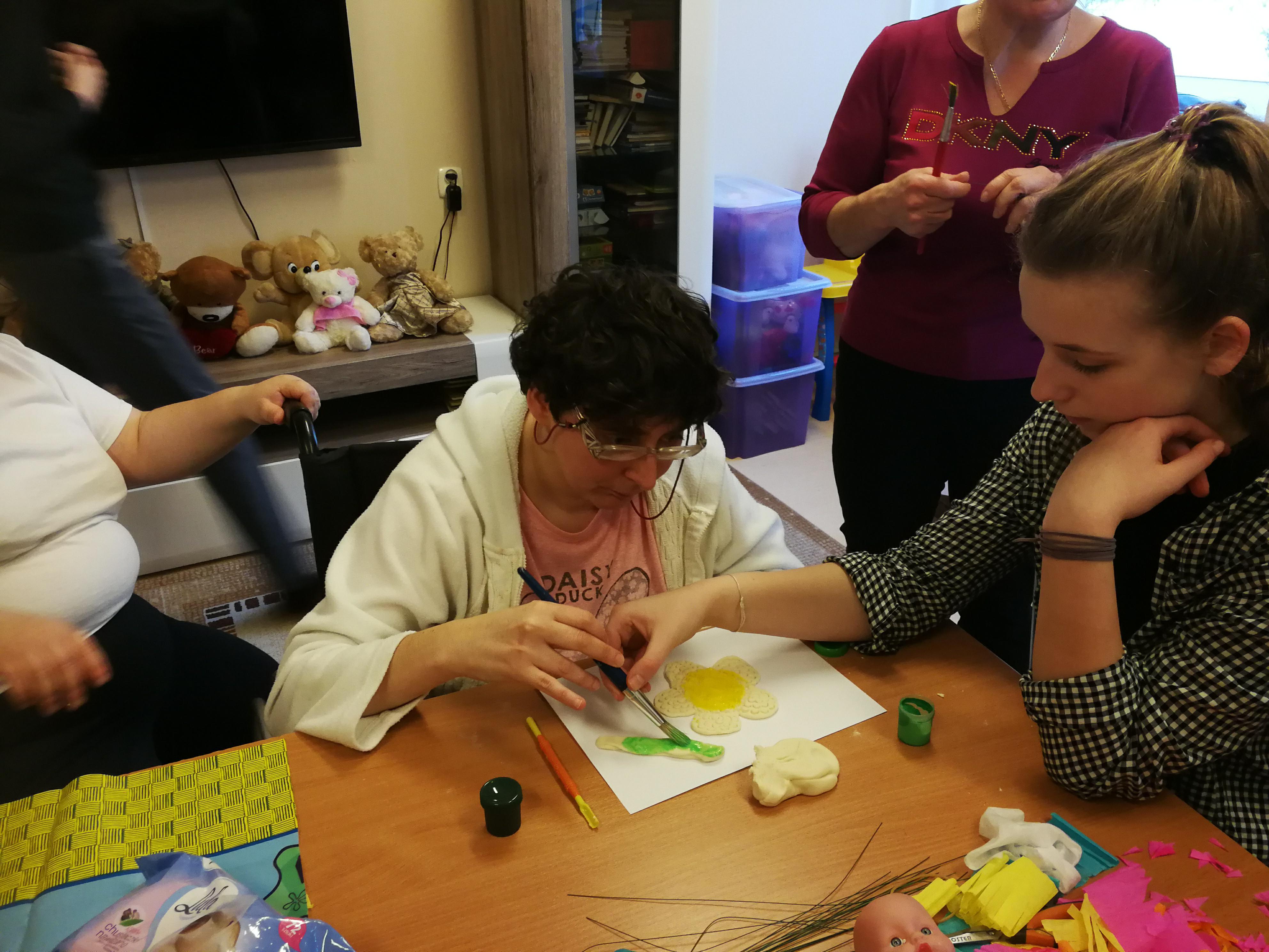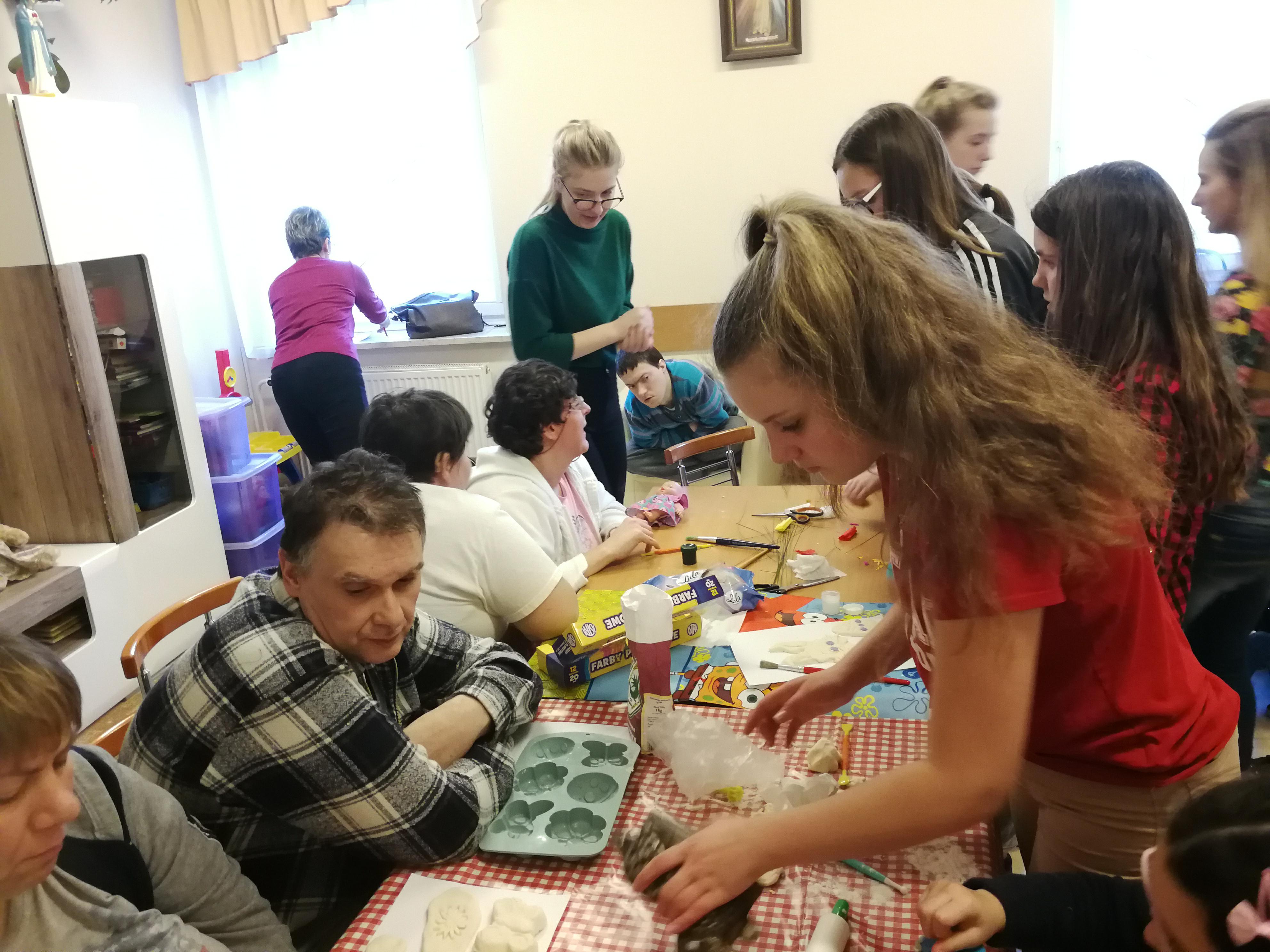 W piątkowe popołudnie 9 marca, spotkaliśmy się z naszymi Przyjaciółmi z Ośrodka w Jadownikach Mokrych aby wykonywać ozdoby wielkanocne. Z masy solnej, przygotowanej przez Patrycję i Julitę, wykonywaliśmy zajączki, kurczaczki, pisanki i koszyczki. Z bibuły i krepiny różnokolorowe, wiosenne kwiaty. Wspólna spędzony czas sprawił wszystkim radość i zadowolenie oraz był przyjemną odmianą zwykłej codzienności dla obydwu stron.