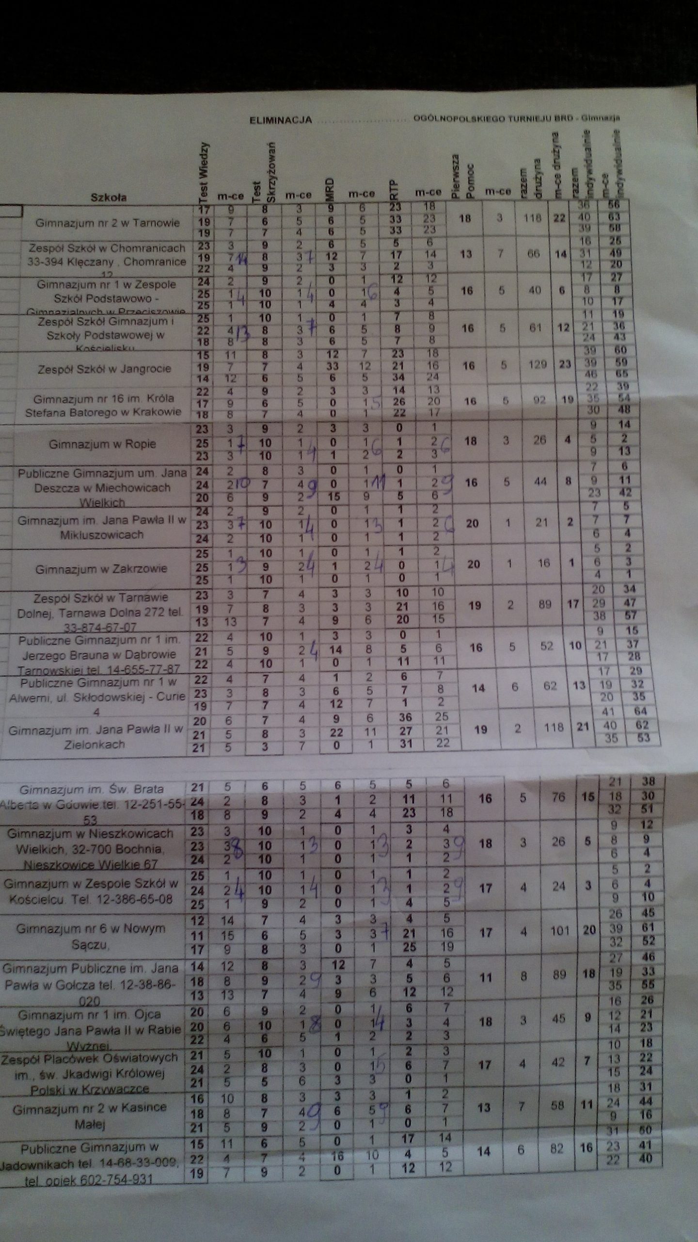 W etapie wojewódzkim biorą udział drużyny z 22 powiatów małopolski. Każdy powiat reprezentują 3-osobowe drużyny. Powiat tarnowski ziemski reprezentowała 3 osobowa drużyna z gimnazjum w Miechowicach Wielkich w składzie: Adrian Baran, Albert Bratko i Dominika Pudło. Społecznym opiekunem drużyny jest Lucja Kołaczyńska. Na eliminacjach stawiło się 23 reprezentacji powiatów, czyli 69 zawodników. Gospodarzy zgodnie z regulaminem może reprezentować dodatkowa drużyna. Pomimo bardzo dużej i mocnej konkurencji, bardzo wysokiego poziomu turnieju walczyliśmy dzielnie. Rozwiązanie testu ogólnego poszło dobrze, uzyskaliśmy miejsce 2,2,6 (Adrian, Dominika, Albert); Miasteczko ruchu drogowego bezbłędnie pojechali Adrian i Dominika, a na torze przeszkód Adrian nie zrobił żadnego błędu, Dominika 1. W klasyfikacji końcowej zajęliśmy dobre, ósme miejsce.