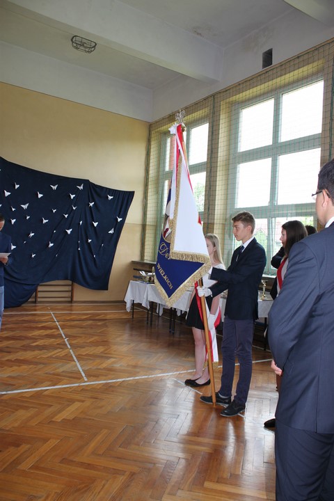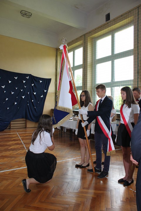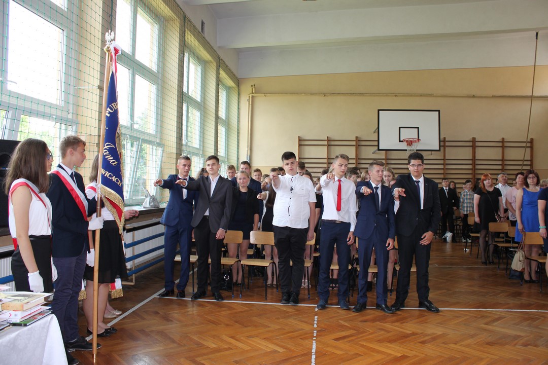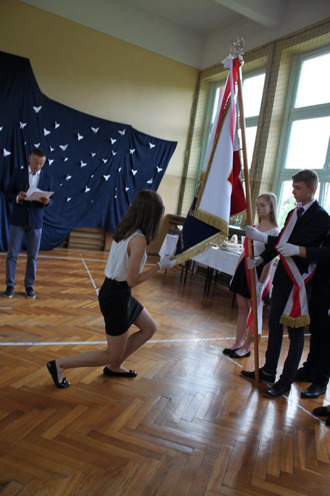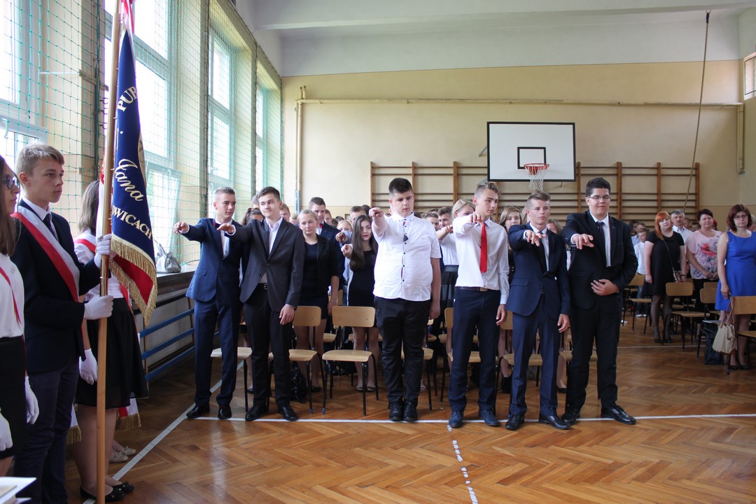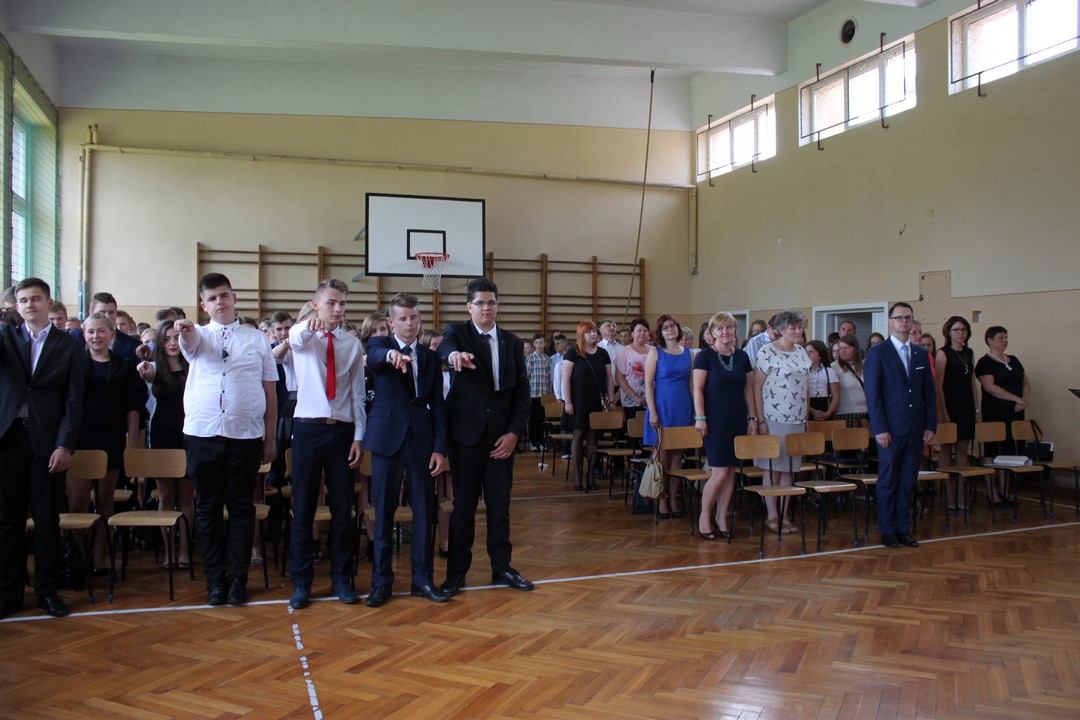 Po mszy świętej udaliśmy się do szkoły. W sali gimnastycznej odbyła się dalsza część uroczystości. Zaproszenie przyjęli: Wójt Gminy Wietrzychowice – Tomasz Banek, rodzice uczniów. Zaproszonych gości, nauczycieli i młodzież gimnazjum powitała serdecznie pani dyrektor Jadwiga Łucarz. Młodzież klas trzecich złożyła ślubowanie,odbyło się także uroczyste przekazanie sztandaru szkoły młodszym kolegom.