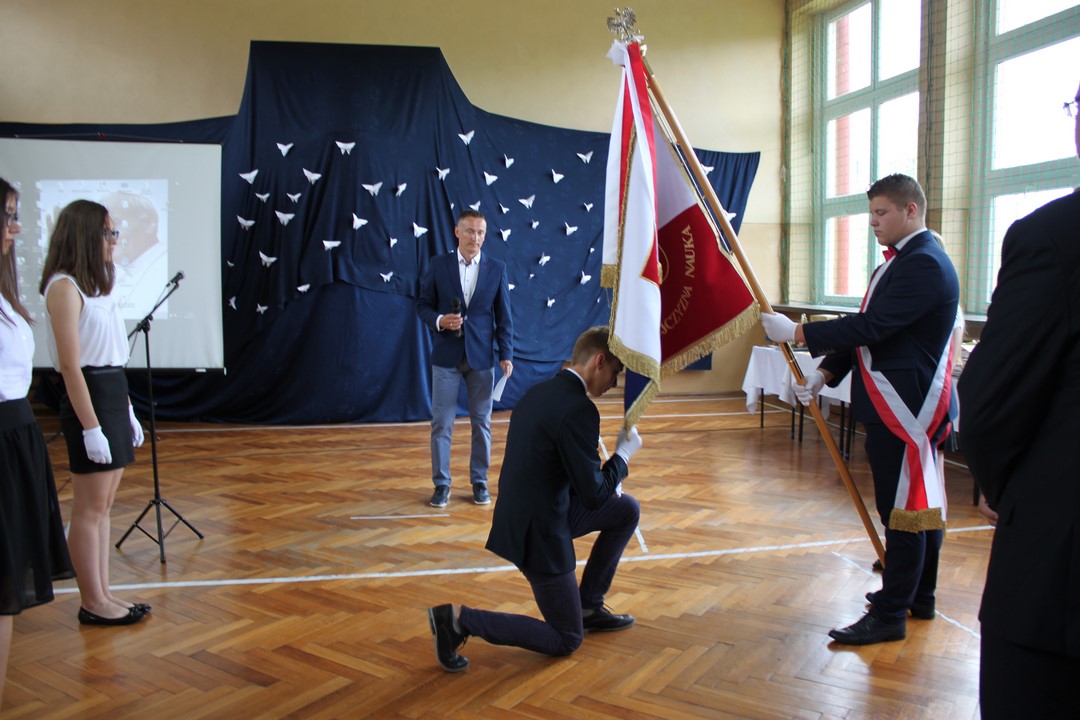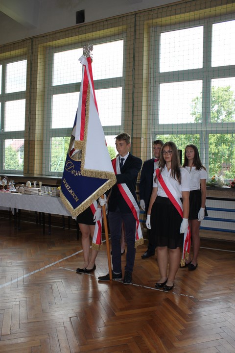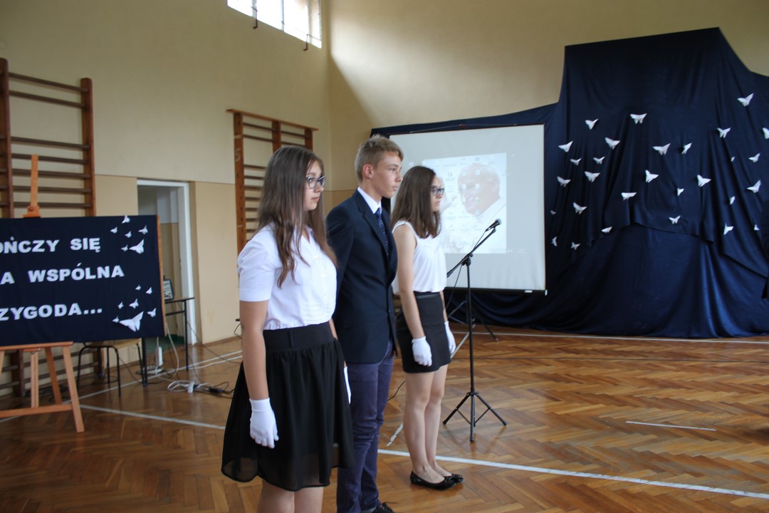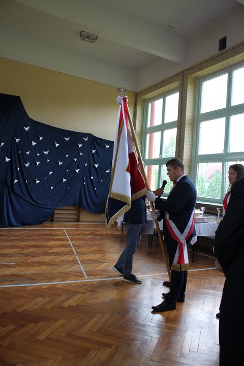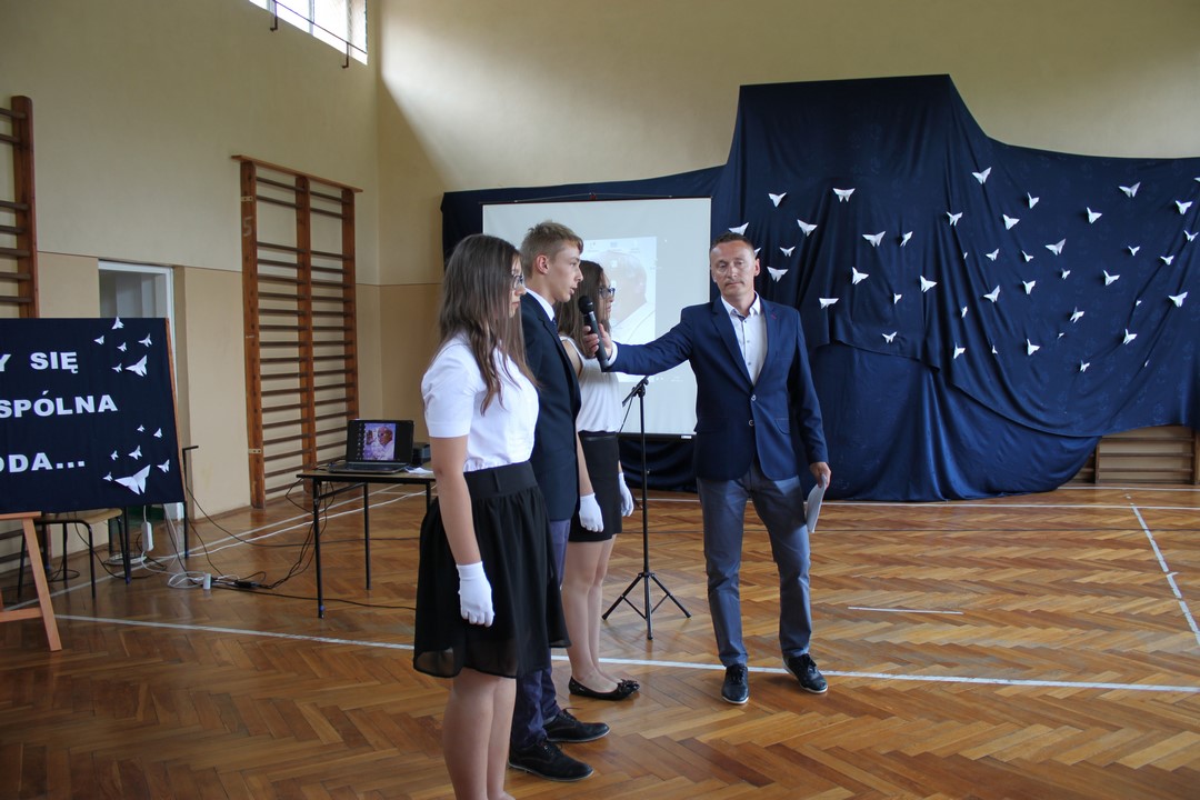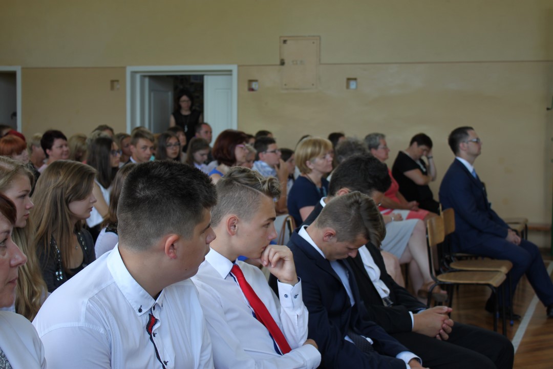 Po mszy świętej udaliśmy się do szkoły. W sali gimnastycznej odbyła się dalsza część uroczystości. Zaproszenie przyjęli: Wójt Gminy Wietrzychowice – Tomasz Banek, rodzice uczniów. Zaproszonych gości, nauczycieli i młodzież gimnazjum powitała serdecznie pani dyrektor Jadwiga Łucarz. Młodzież klas trzecich złożyła ślubowanie,odbyło się także uroczyste przekazanie sztandaru szkoły młodszym kolegom.