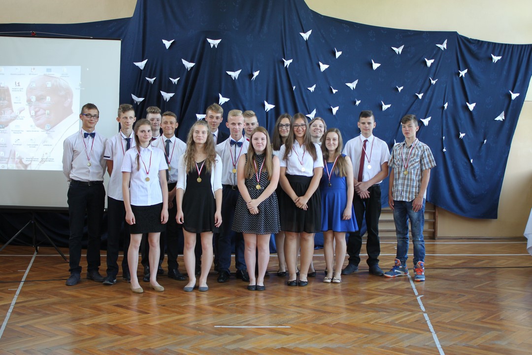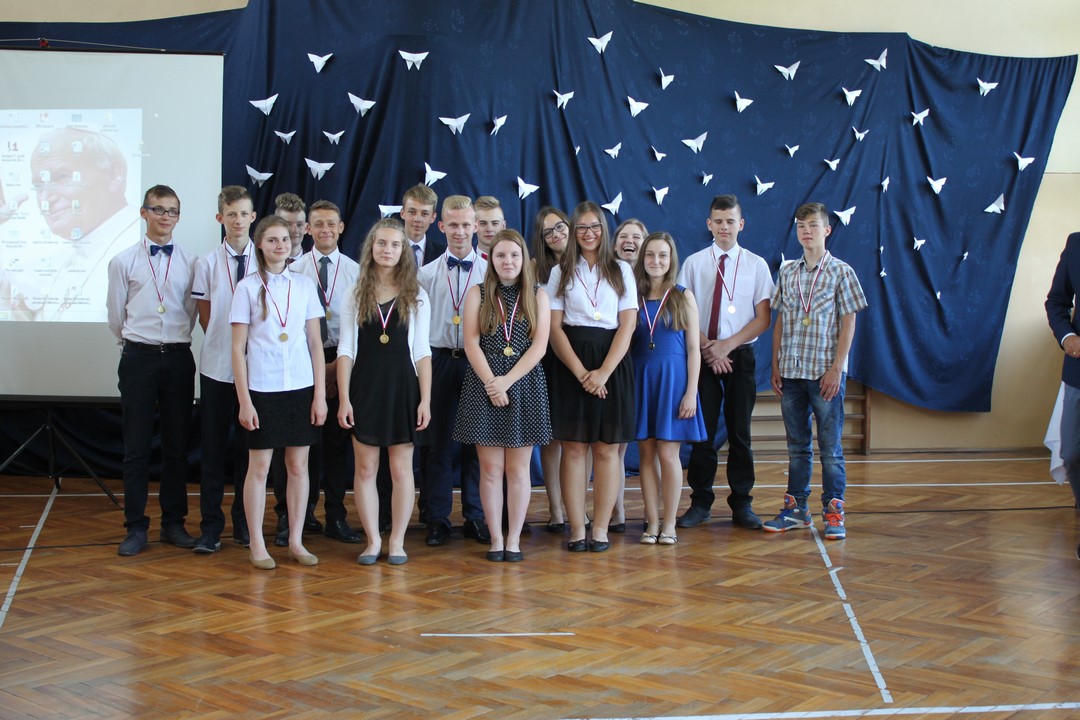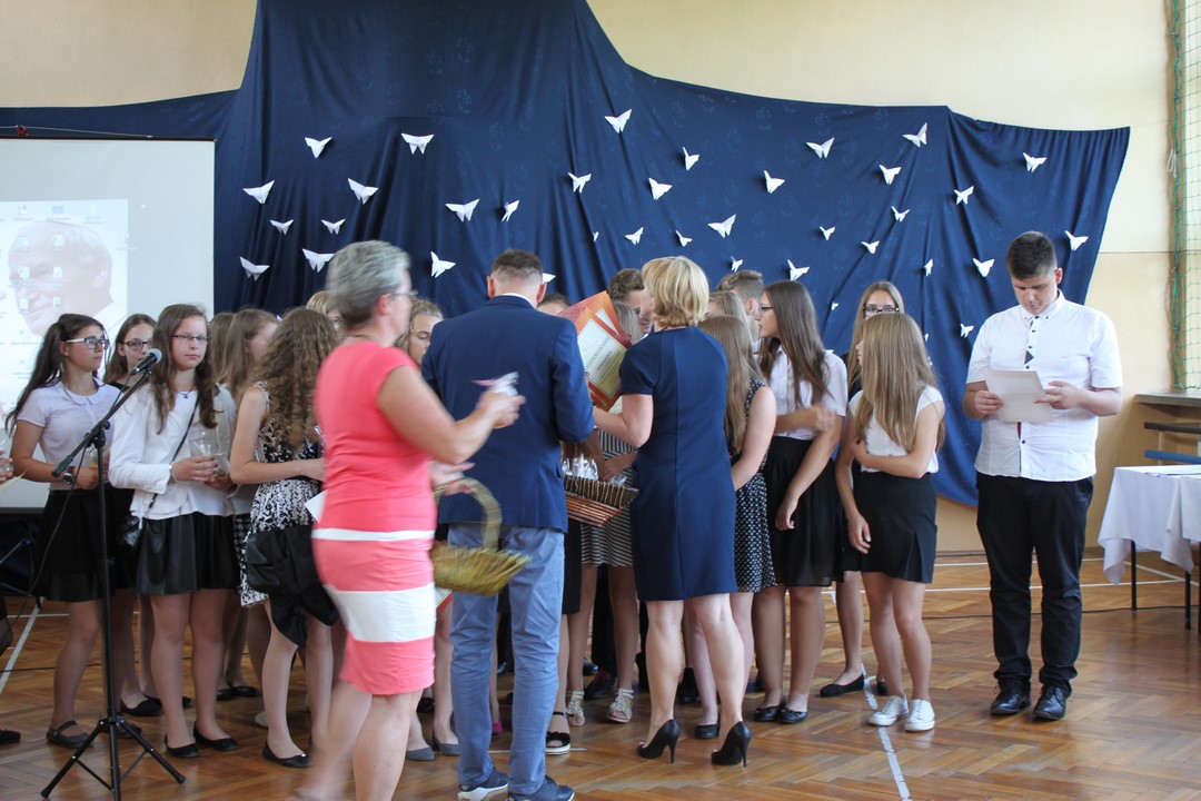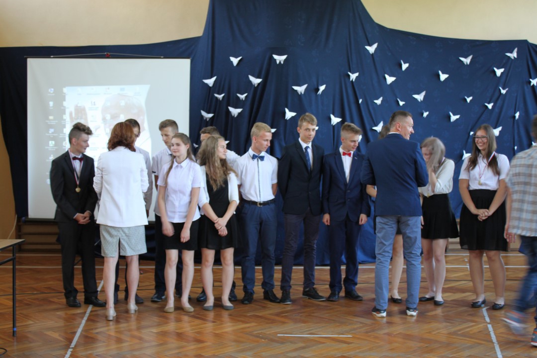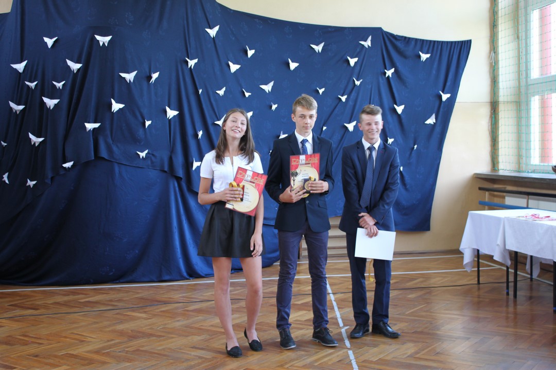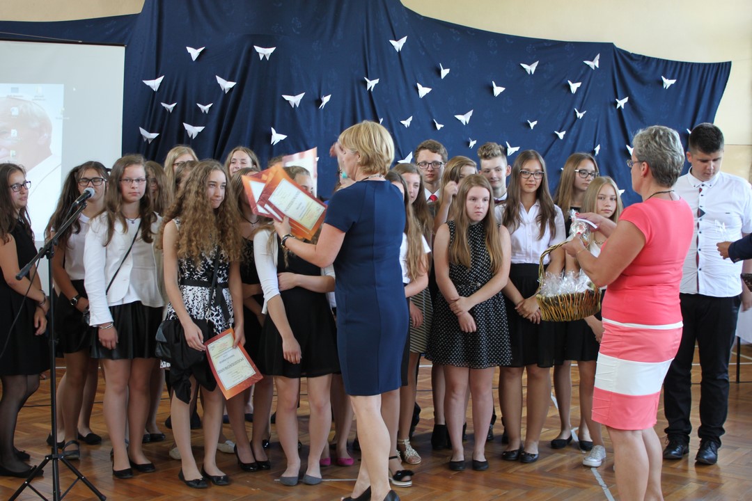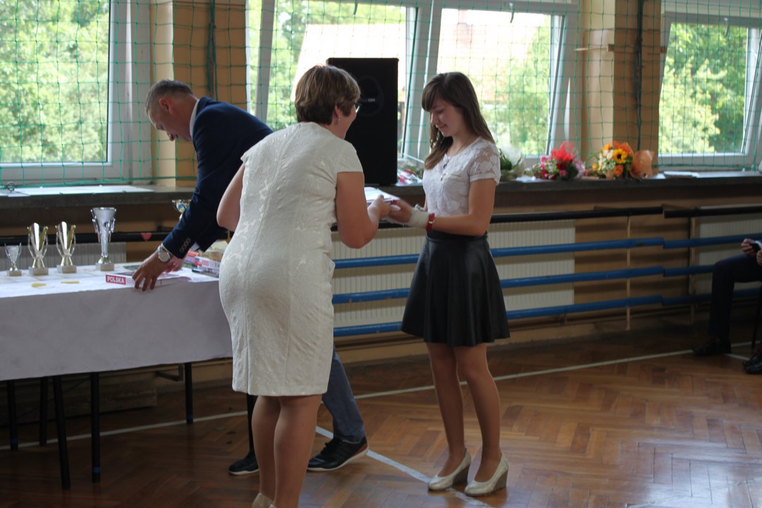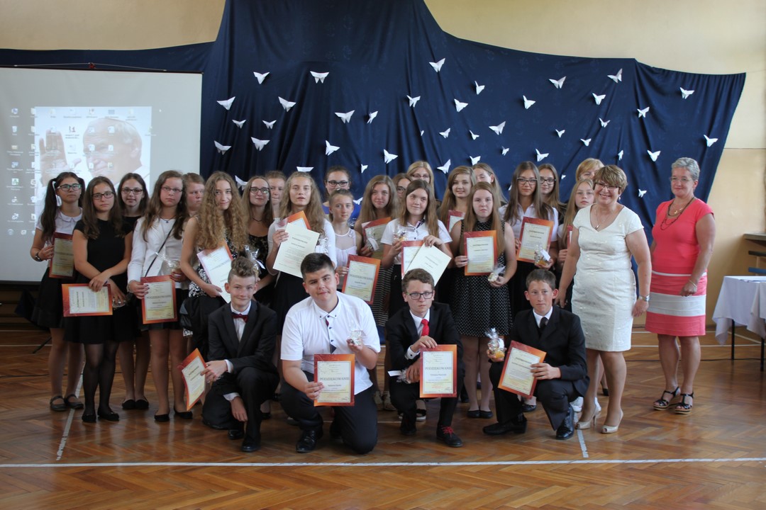 Uczniowie ze 100% frekwencją w tym roku szkolnym otrzymali pamiątkowe dyplomy i gadżety. Po raz pierwszy Wiktoria Pająk otrzymała nagrodę za 100% frekwencję przez 3 lata nauki w gimnazjum.